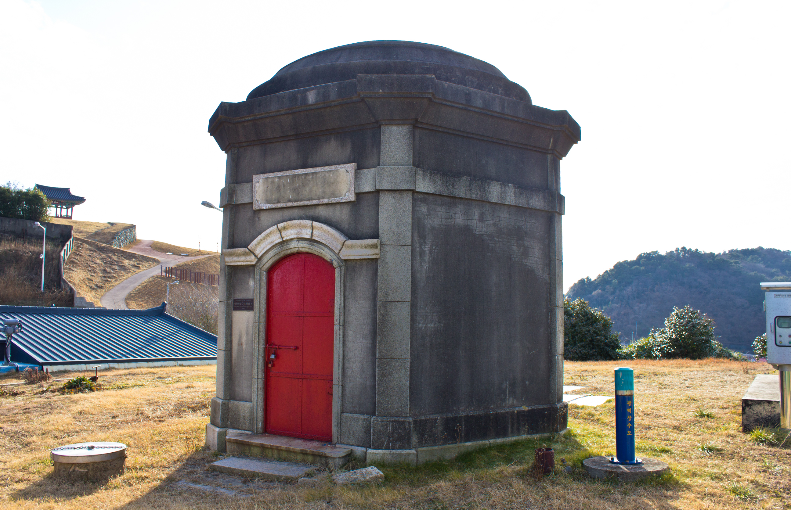 Tongyeong’s old water supply buildings sit at the peak of a hill surrounded by Seopirang Village (서피랑마을). The hexagonal structure with the arched doorway and domed roof was built in 1933. Its style resembles that of other colonial city water facilities across the Korean peninsula.