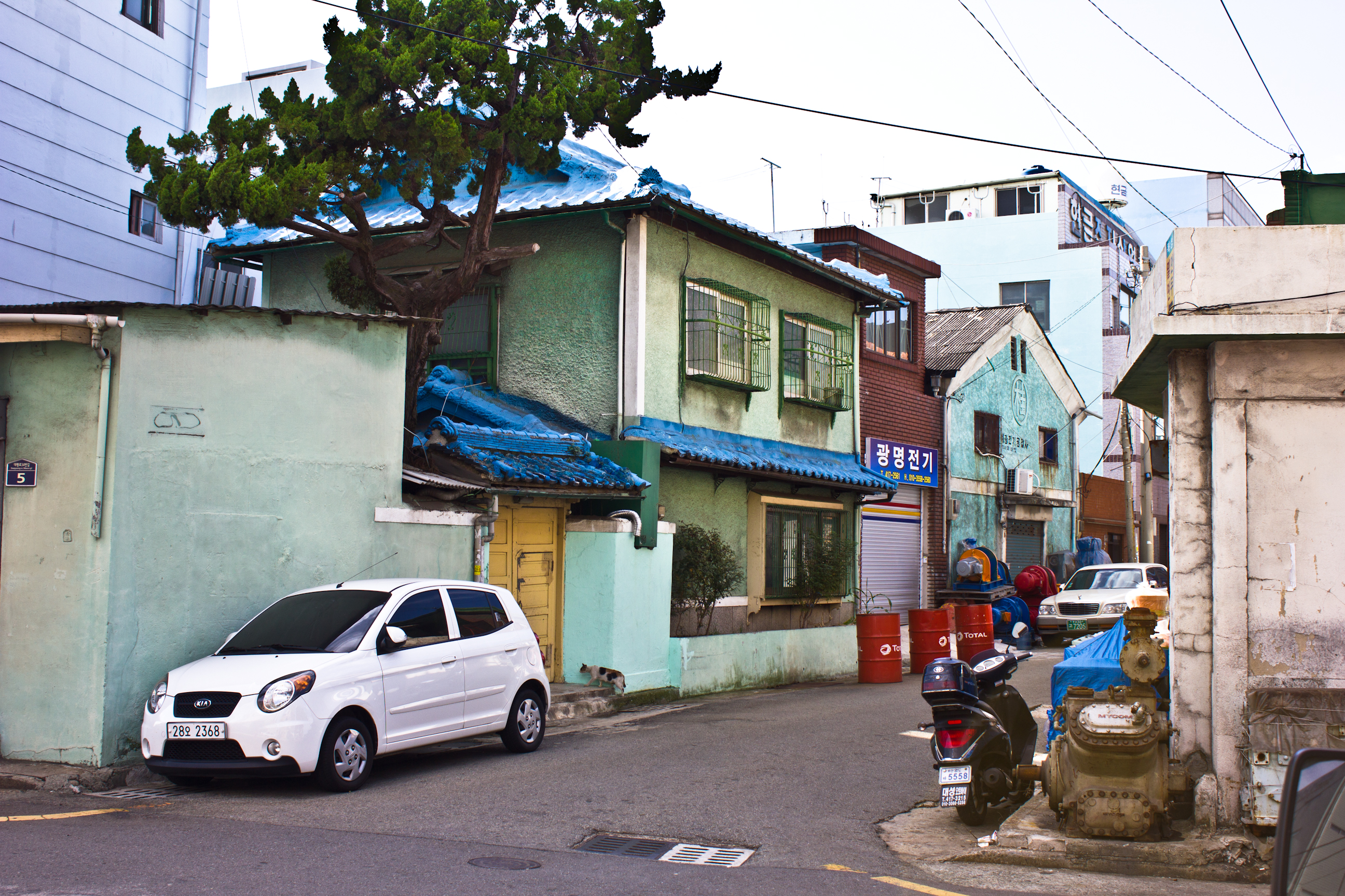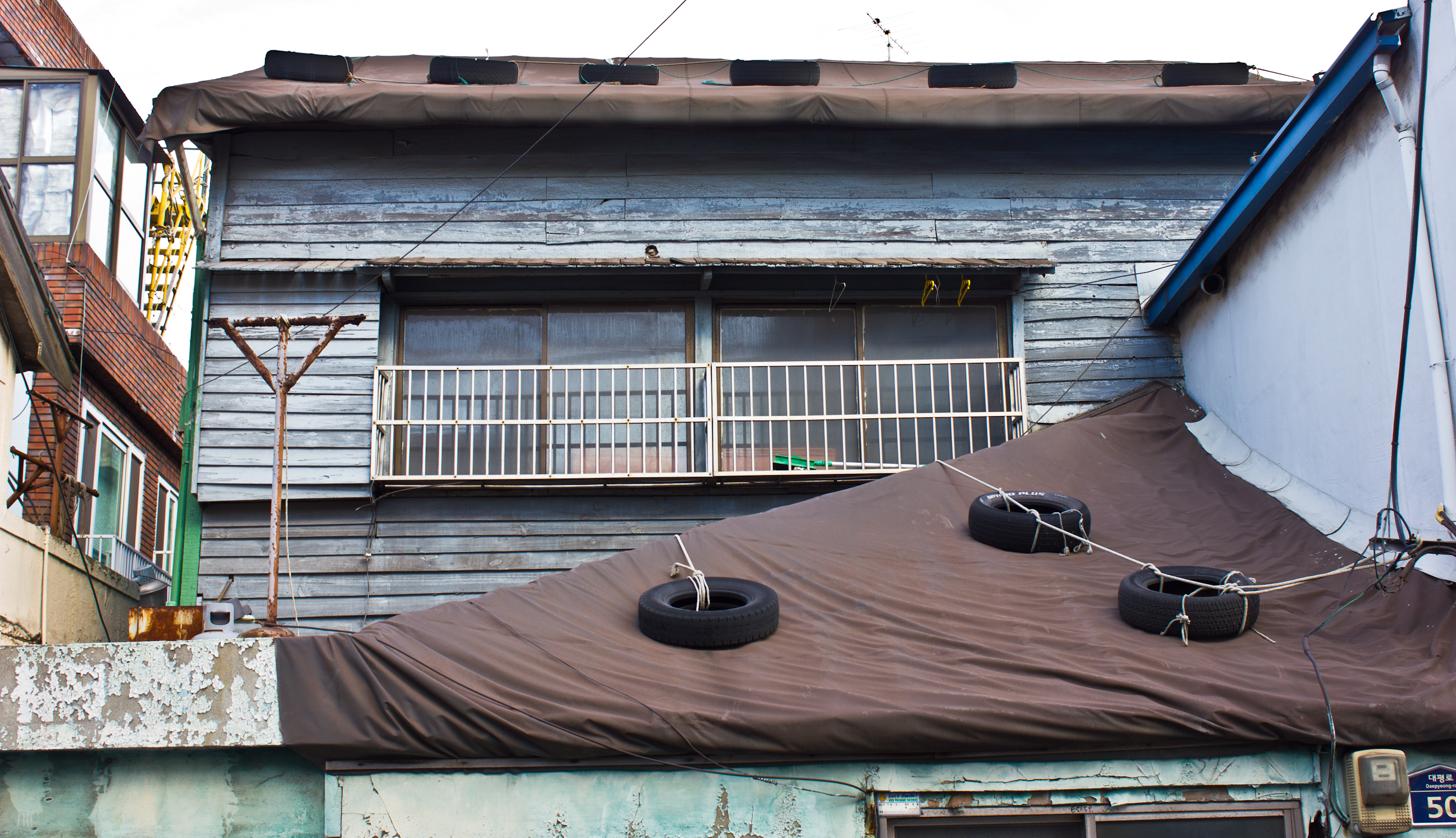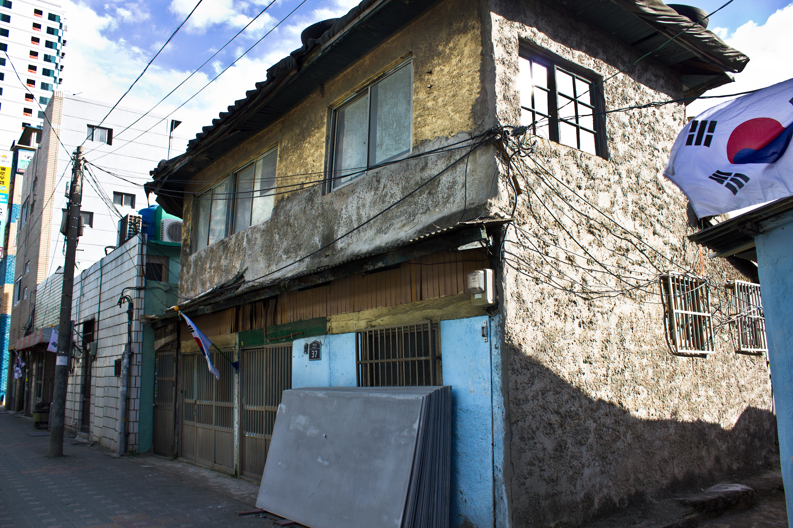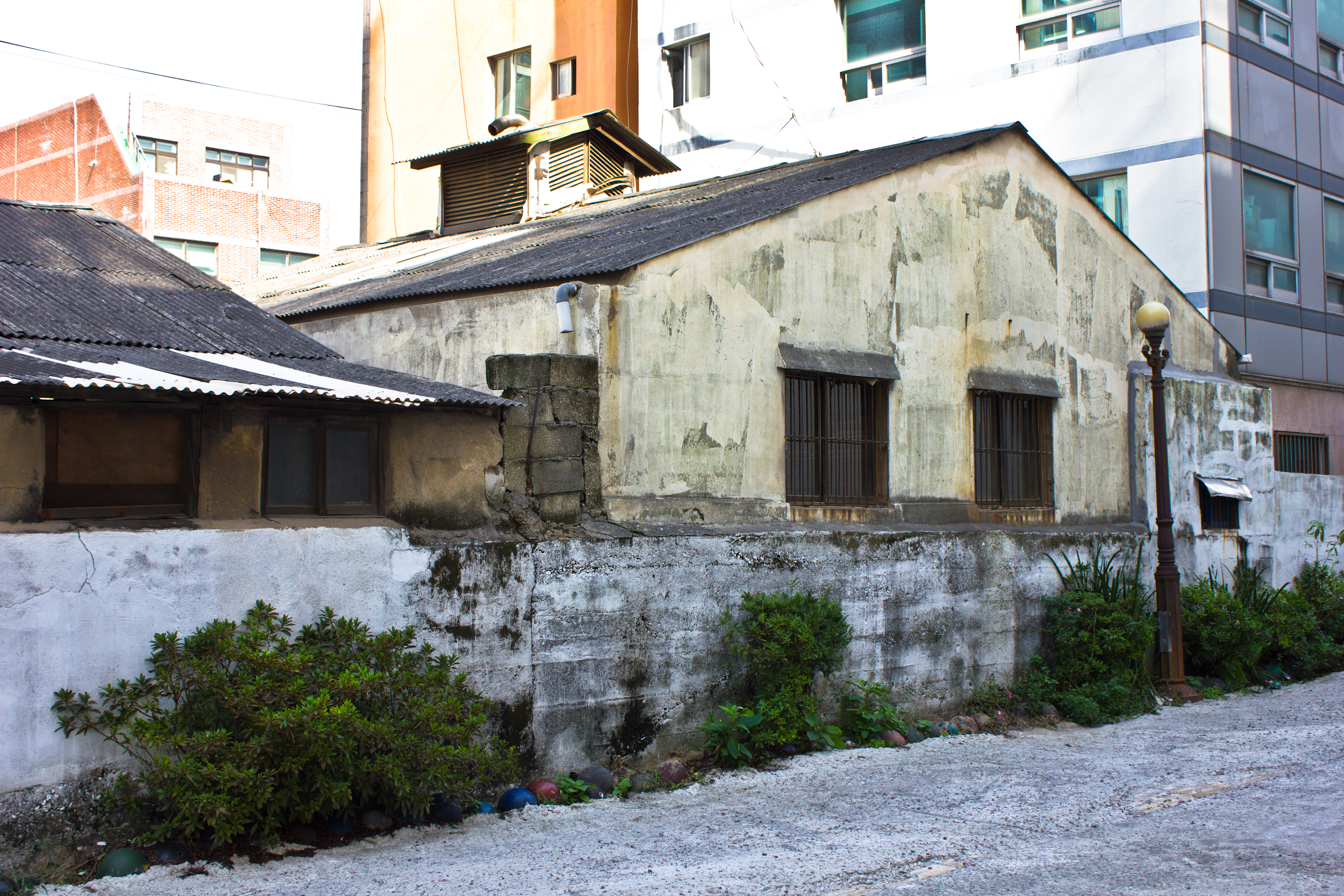 Yeongdo’s history is still evident in the number of brick warehouses that remain. Many have been cemented over, but between cracked bits of concrete, the original red bricked frames can be seen. A few, like one pictured below, remain completely exposed. Another common feature of Japanese warehouse design was raised, gabled roof venting that allowed for air flow. However, there are more than just warehouses along Yeongdo’s coastline. The neighborhoods of Daepyeongdong 2(i)-ga, Daepyeongdong 1(il)-ga, Daegyodong 1(il)-ga, Daegyodong 2(i)-ga, Bongnaedong 1(il)-dong, and Namhang-dong retain colonial shops, Japanese homes, modernist corner buildings, and company houses.