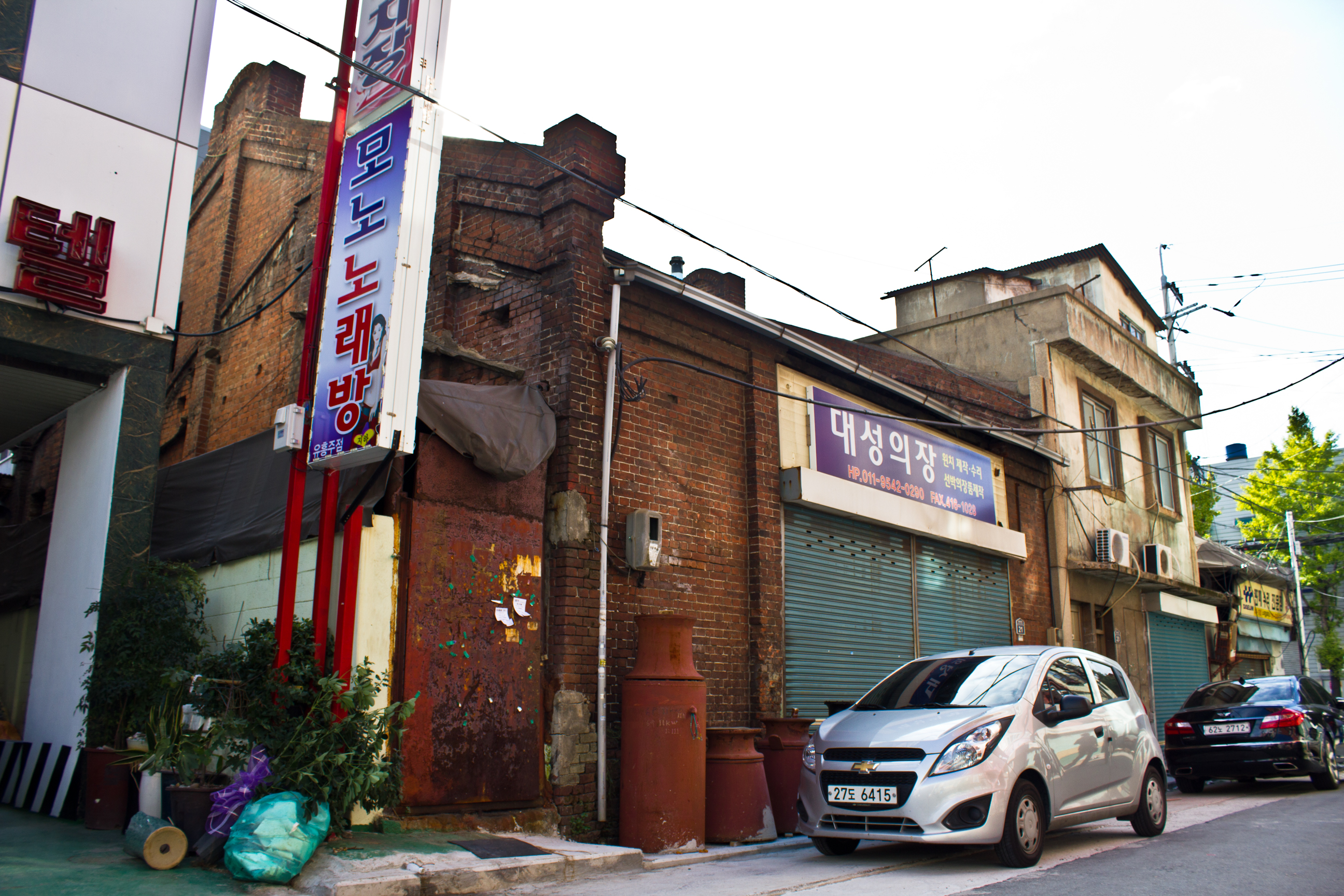 A number of the smaller buildings are now occupied by machinists, engineers, and mechanics. A handful may be offices, but many workshops were outfitted with vertically sliding garage doors. The neighborhoods of Daepyeongdong 2(i)-ga, Daepyeongdong 1(il)-ga contain modernist corner buildings, Japanese homes, and even a warehouse structure that appears to retain its original company logo on the facade.
