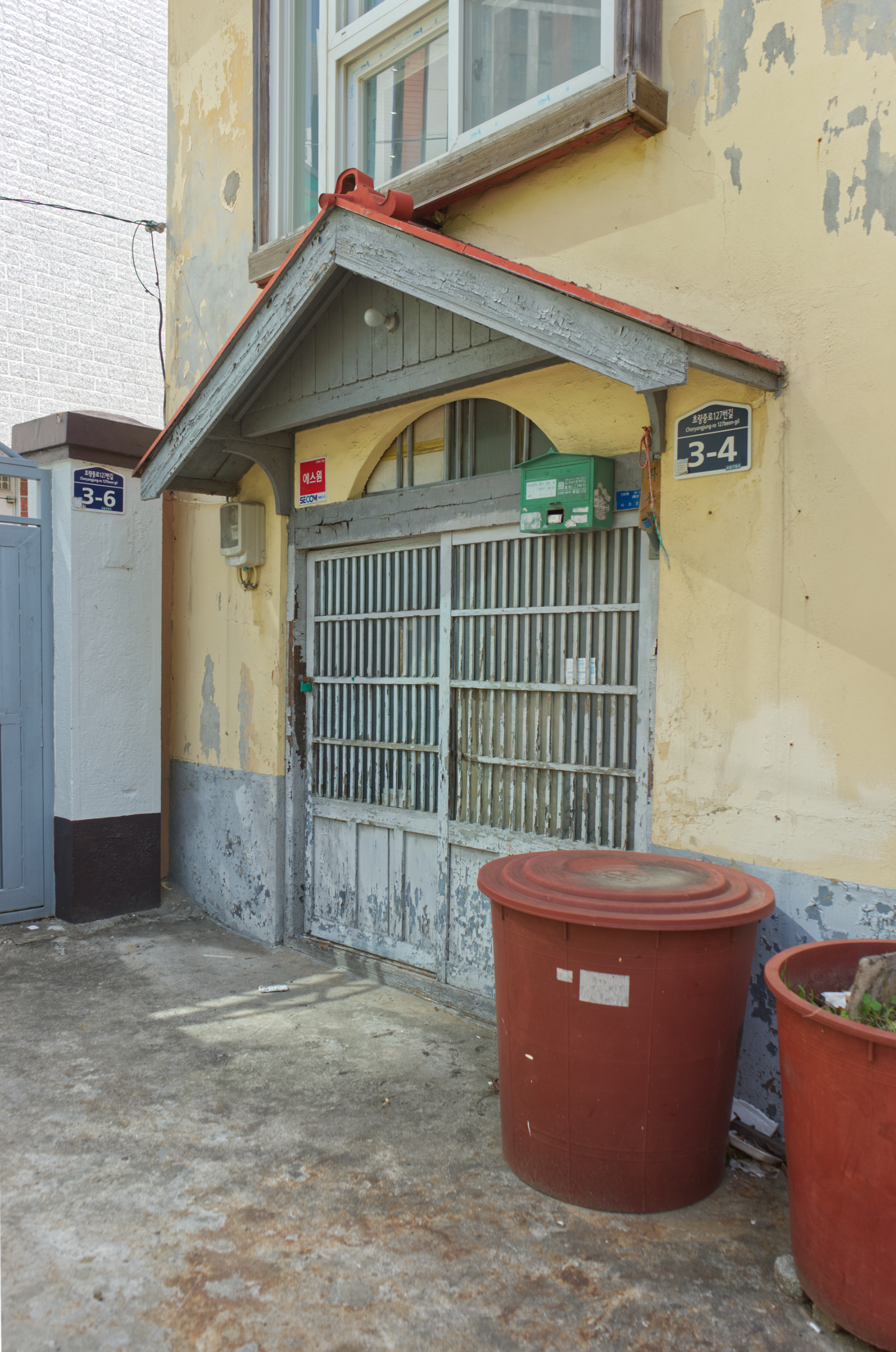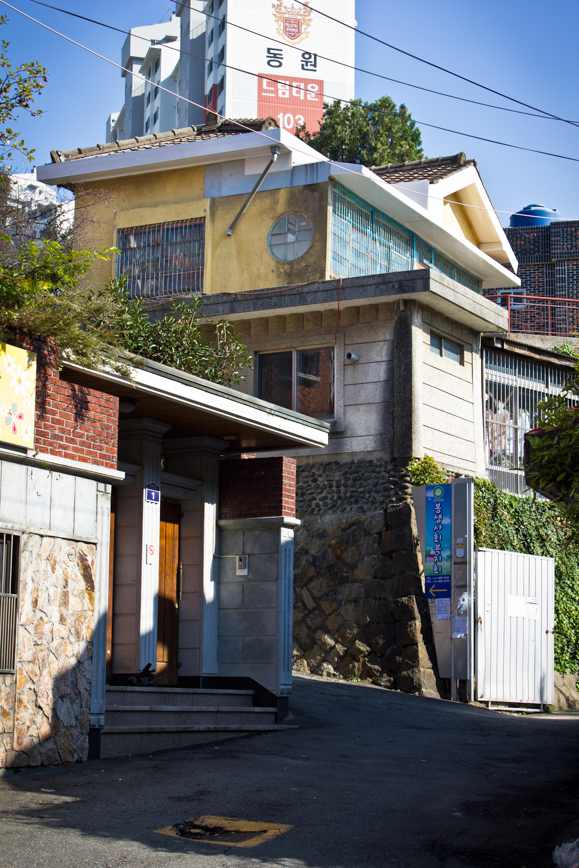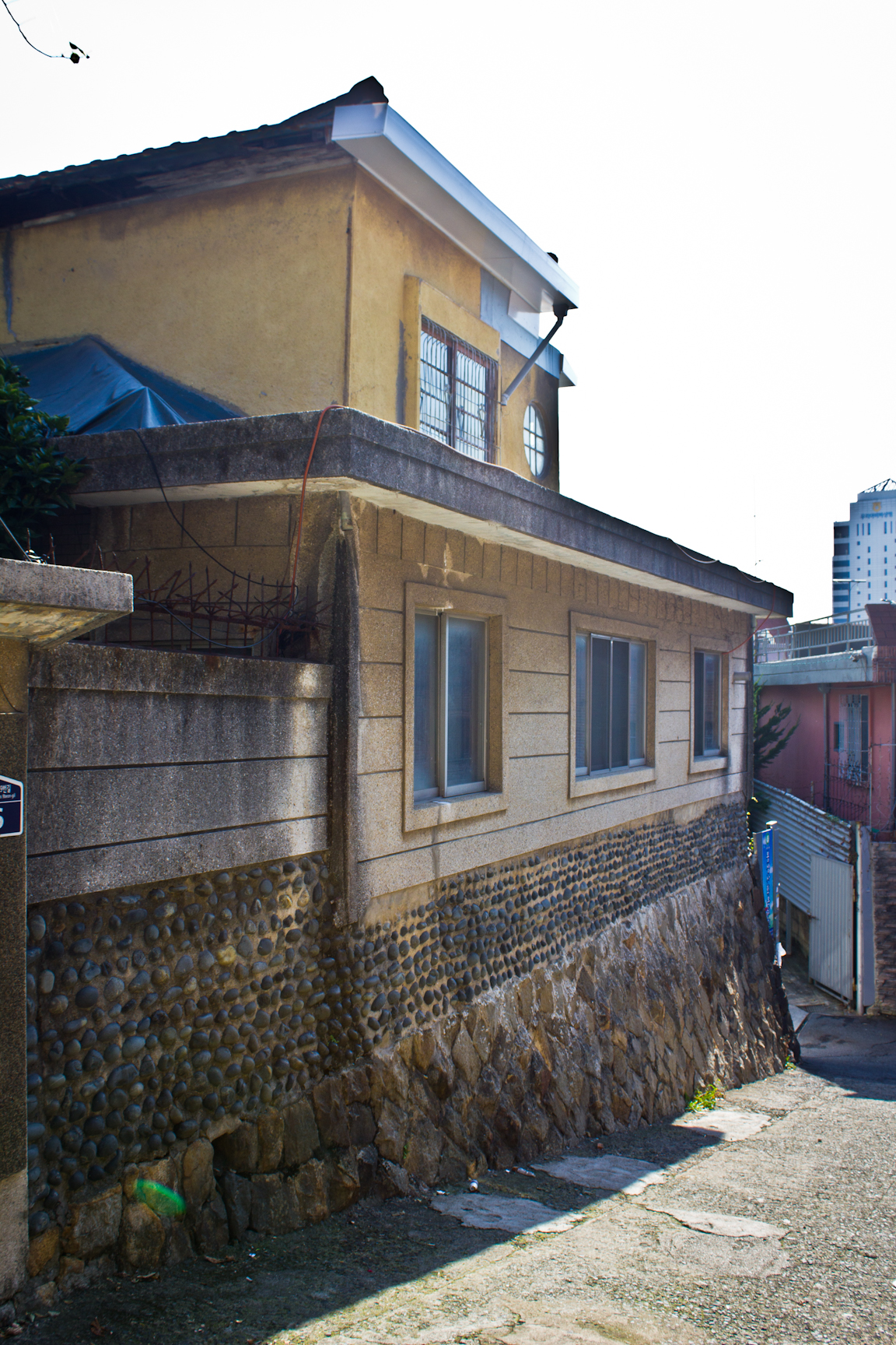Heading towards the mountain up Jwacheonnam-ro will take you to one more old Japanese house built atop a stone retaining wall. Painted in yellow and partially refinished with cement along the first floor, its second floor retains a lot of its “Japanese-ness”. Aside from its frame, its most telling feature is a beautiful circular window. While it may be impossible to know how common of an architectural feature this was at the time, there are at least six remaining early modern buildings in Busan that have this same window design – with one clear example being the pink Japanese house in Nampo-dong.