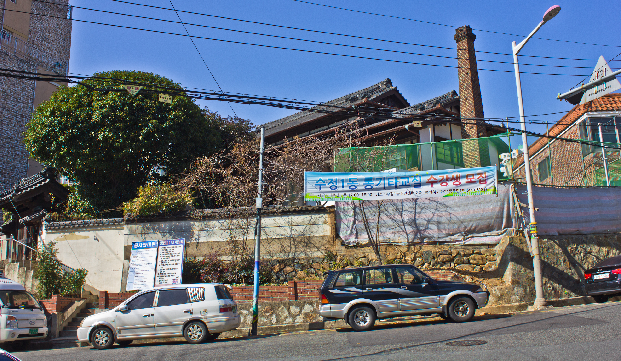 UPDATE – June 24, 2017: This building, which apparently has a lot of misinformation being spread about it (which I unfortunately contributed to as I was, and still am, learning when I originally wrote about this house here), was built in 1943. Originally, this lot was in a rural area and consisted of rice paddy. This was still true in 1912, when the rice paddy was bought by Hazama (yes, that Hazama who owned the villa in nearby Dongnae) and two other investors. Hazama bought out the shares of the other investors in 1917 and, in 1922, the city granted a change in register of the property, making it available for general building purposes. A man named Ohara, who owned and lived in a house directly across from this property, bought the land from Hazama in 1925 and built a house on it, renting it out to others. As the area developed into a modern neighborhood, a rich shipowner named Tamada bought the home in 1939 and continued to lease it out until 1942. (Note that Tamada had another home in Donggwang-dong). In November of 1942, Tamada demolished the home and built a new one that he moved into in 1943. After liberation in 1945, Tamada’s former home was designated as enemy property and used by the military in 1947 (probably as quarters for US/UN forces as was the case with many of these homes, like the Hazama Yugen). The 1943 home changed hands three times after liberation, finally being bought by the Cultural Heritage Administration in 2011.* It is now being used as a public/culture space (문화공감 수정) that serves light refreshments and per my last visit seems to be rather popular. Entry is free and the home is definitely worth visiting. The restoration work leaves something to be desired, but it is one of the better overall restorations of an old Japanese home that I’ve seen in Korea.
