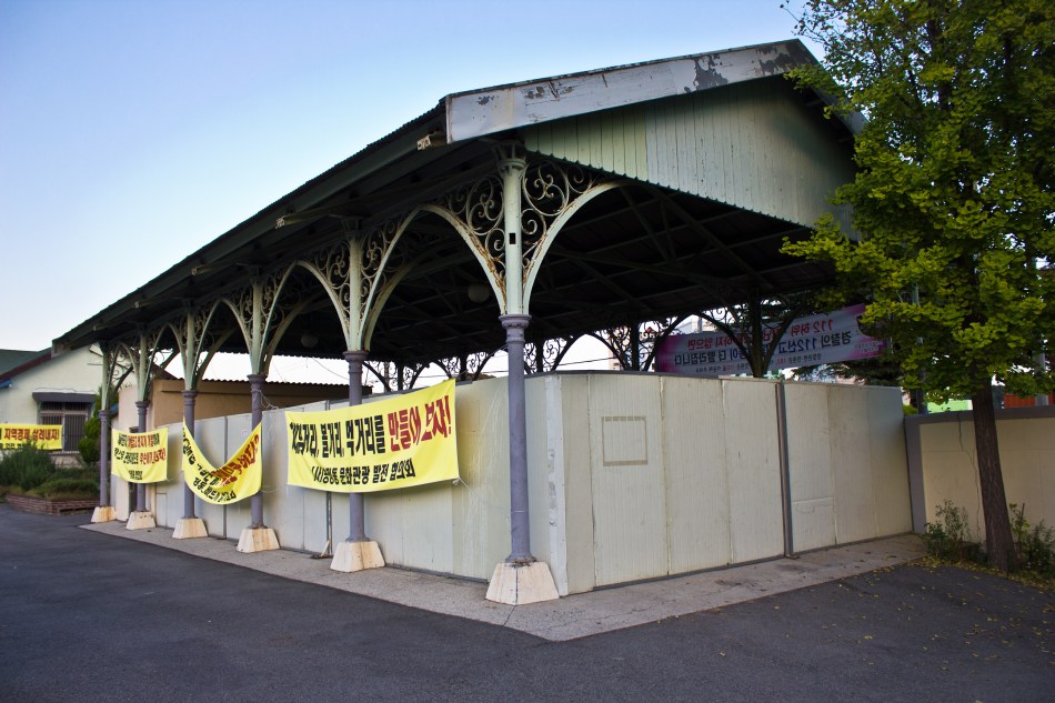 Like a number of other colonial stations across the peninsula, Songjeong Station has seen so many renovations that it isn’t really very representative of the period anymore. However, its general frame and remaining canopy columns are indicators of when it was constructed. The first train on this Southeastern Coast Rail Line ran at the end of 1934 and was used for transporting military supplies. By the time of the station’s construction in 1941, marine products from the East Sea, along with other coastal resources, were making their way down the rail line.4 The station itself is typical of the period, but of particular note is the beautiful metalwork on the open air pavilion. This is a design that I have yet to see at any other remaining train station in Korea.