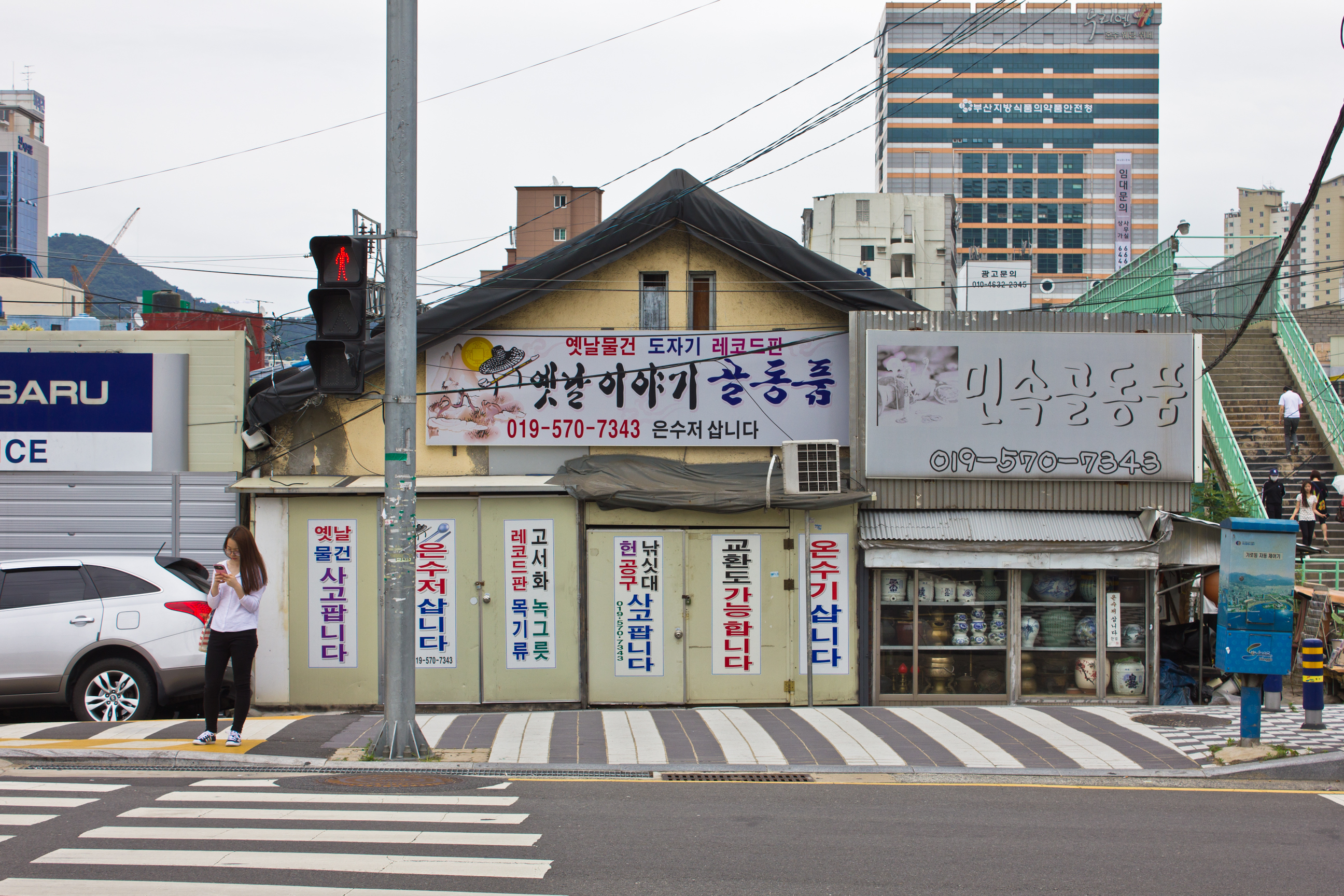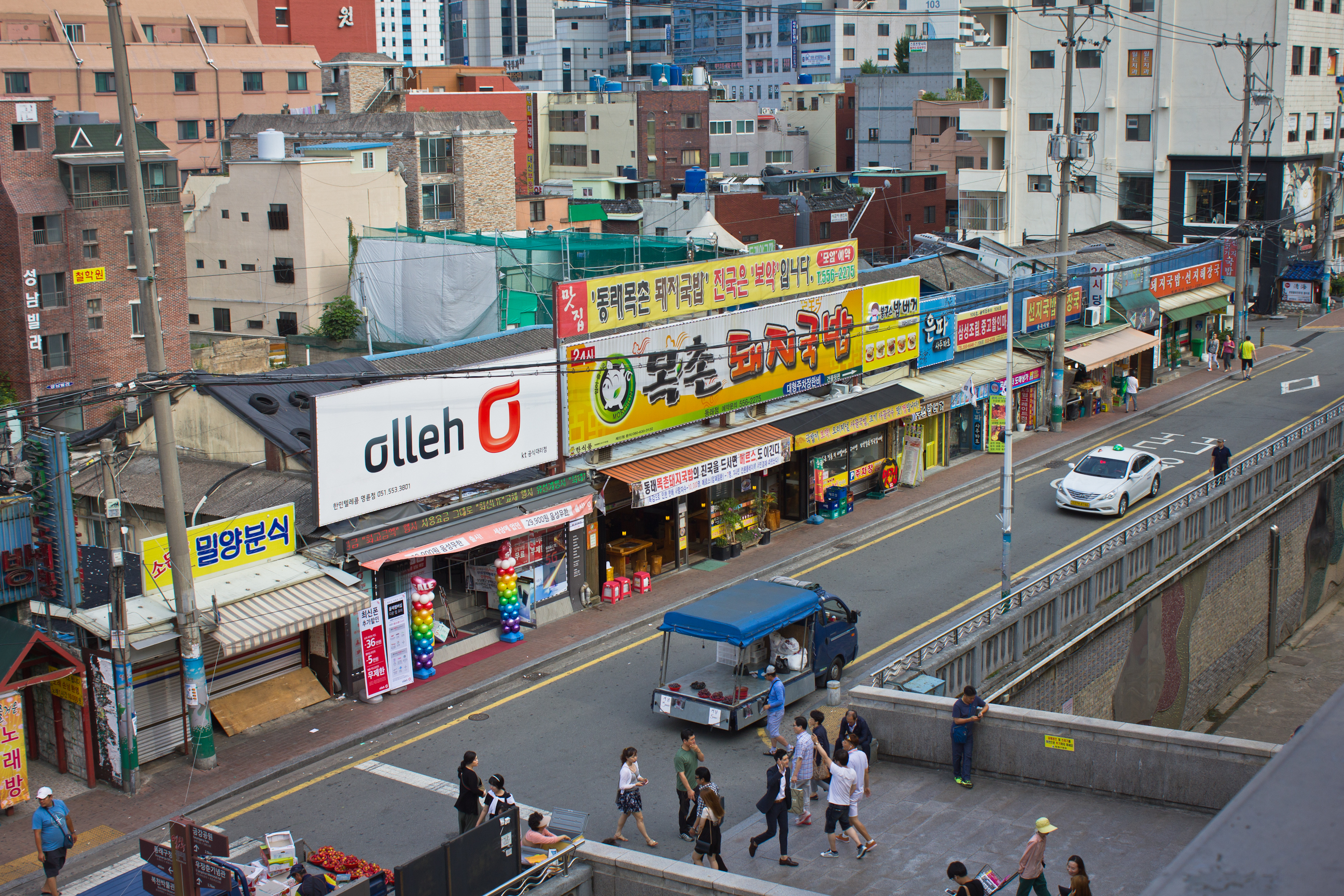 A strip of early modern buildings alone the road outside Dongnae Subway Station remains today, though it is covered with signs and difficult to see. These buildings have likely seen nonstop use since before the station’s construction.