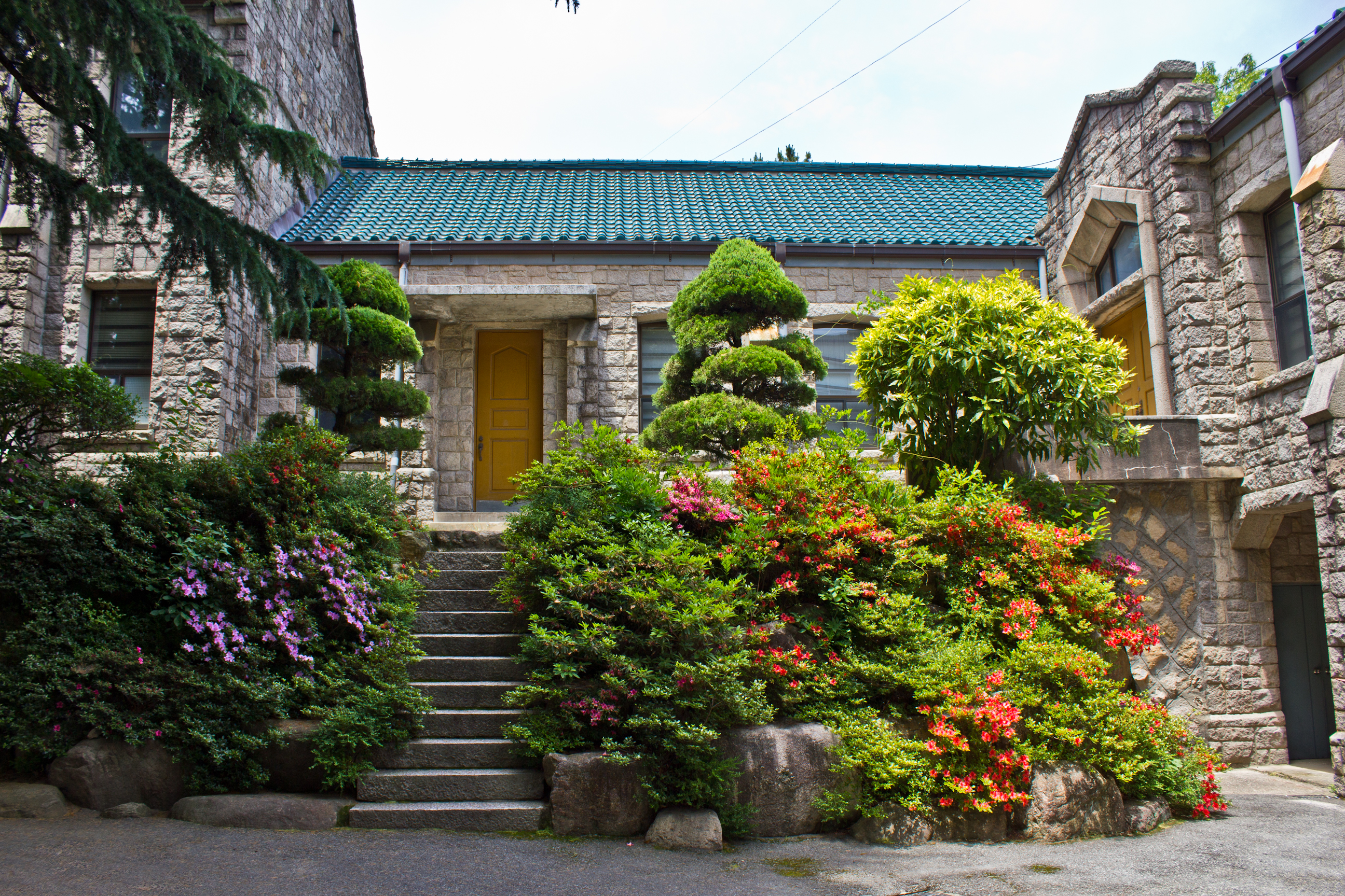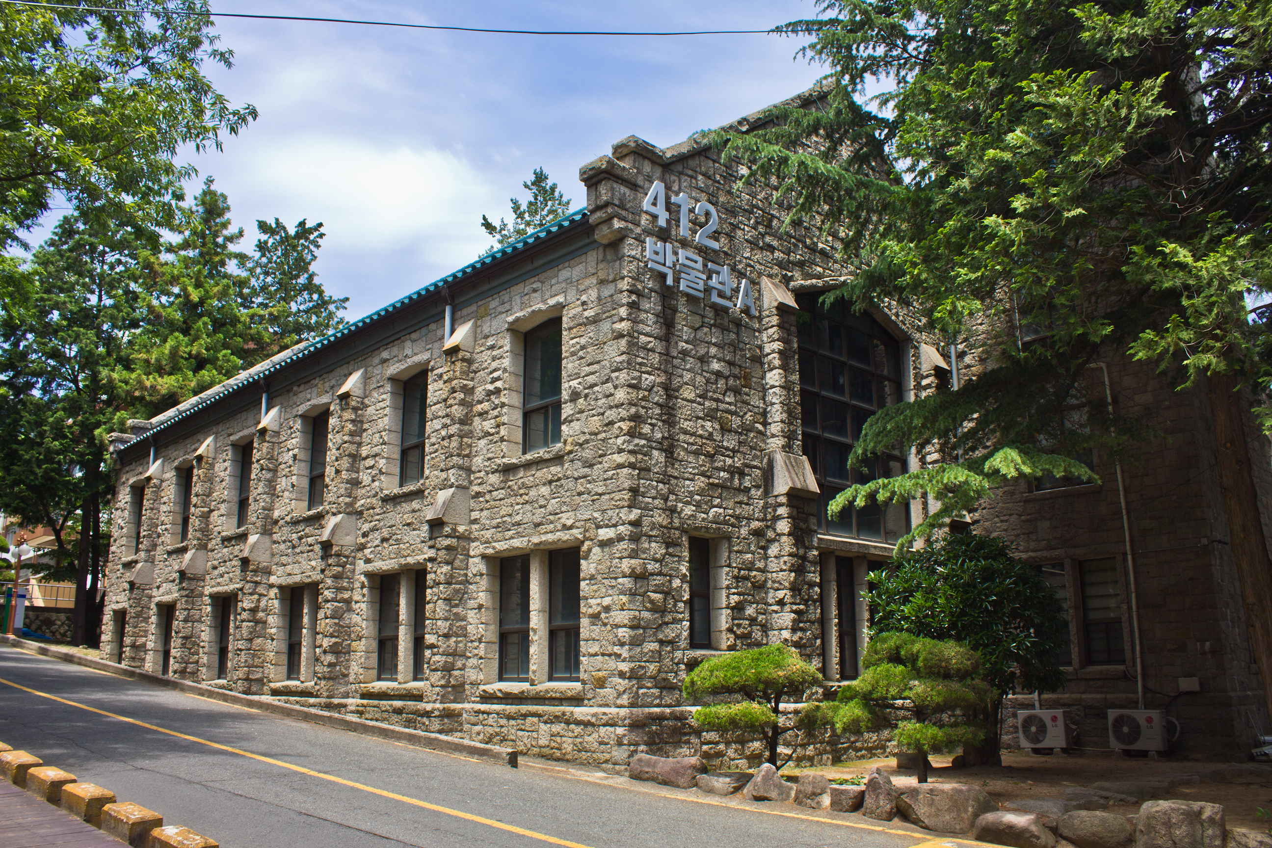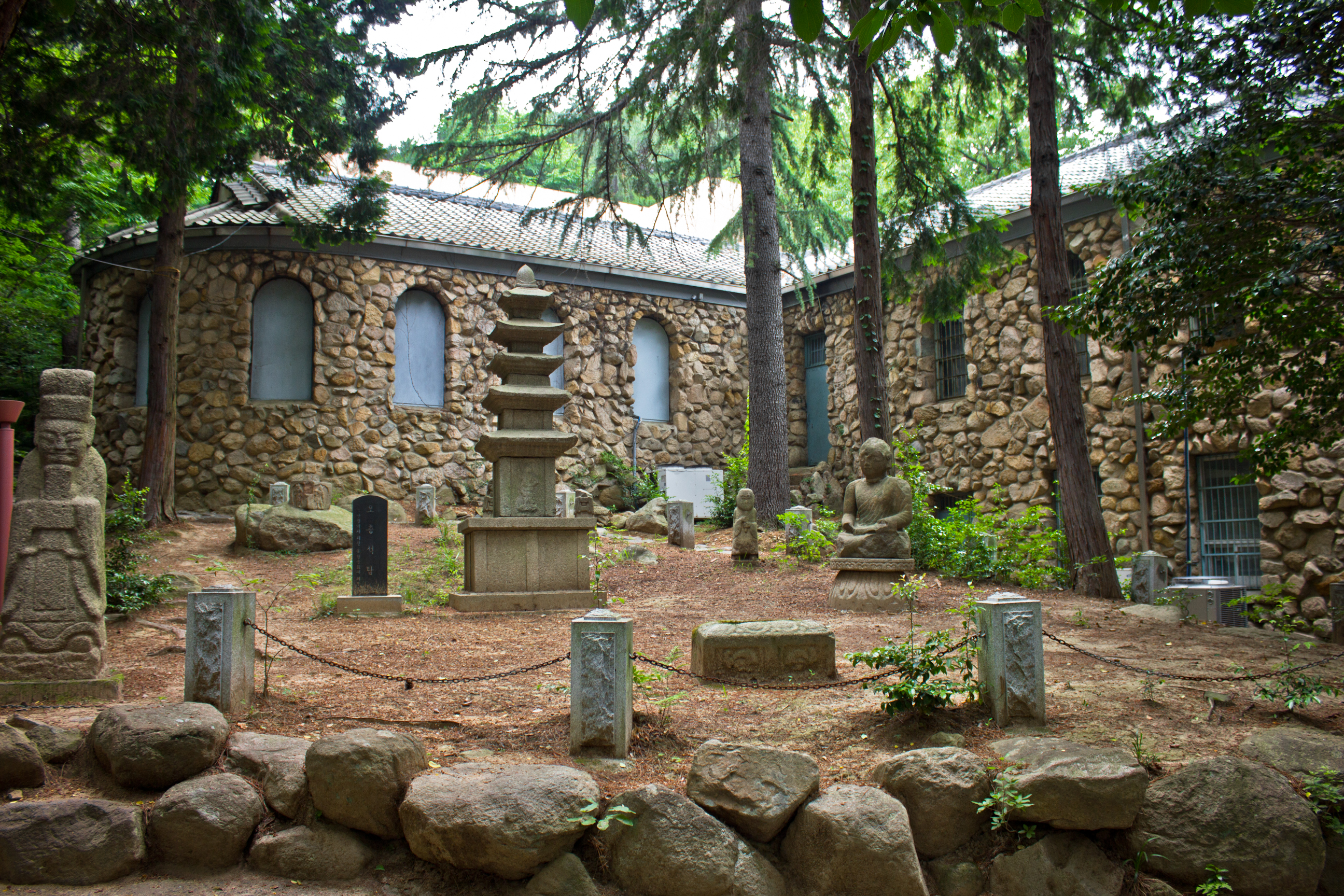 There are two mid-century structures remaining on the campus of Pusan National University. Its Gothic style museum was built of square-cut stones in 1959 by architect Kim Jung-eop (김중업).49 The present day annex, however, was constructed in 1956.50 It was built using a rocaille (pebble) style exterior that makes use of uneven, uncut stones. However, the building also seems to be influenced by early Italian and Byzantine architecture. Judging by old photos, the roof was replaced at some point. The annex was built in an “L” shape with rows of arched windows lining the first and second floors of the long part of the “L” while only one row of windows line the short part of the “L.” Though the annex was used to store “evacuated” national treasures between 1957 and 1960, it wasn’t until 1963 that the building obtained museum status.51 The annex yard now serves as a display for carved stones made before the Joseon era.