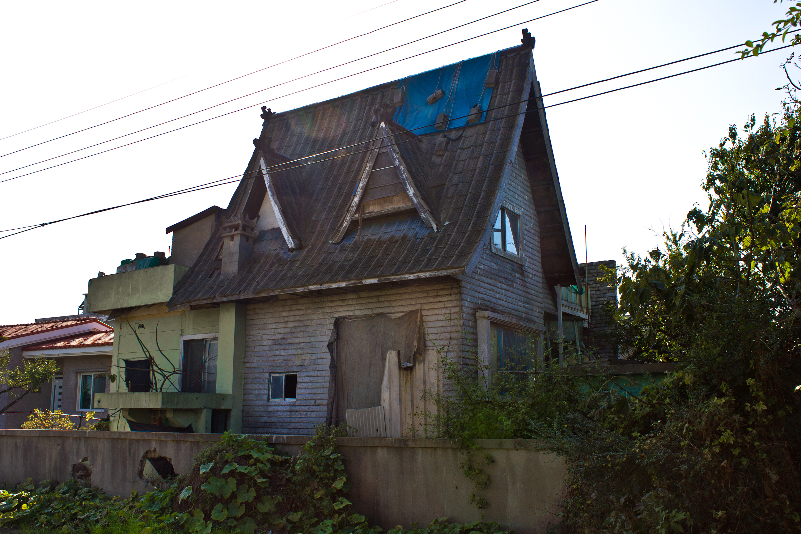 One block west of the old Gangseo-gu school, at the end of Daejeo-ro 255beon-gil, is one more Japanese home. This one has been completely painted in blue, and while its east facade is mostly original, the west side has some interesting changes. The second floor has something resembling scaffolding stuck to its exterior and features the kind of plastic-looking walls that are used in little parking lot attendee kiosks. The first floor of that same side has been refinished in concrete. Interestingly, the windows on the second floor of the west side have been covered over in wood paneling that was perhaps taken from another part of the exterior. There’s also a curious stained glass window in a little room just underneath this.