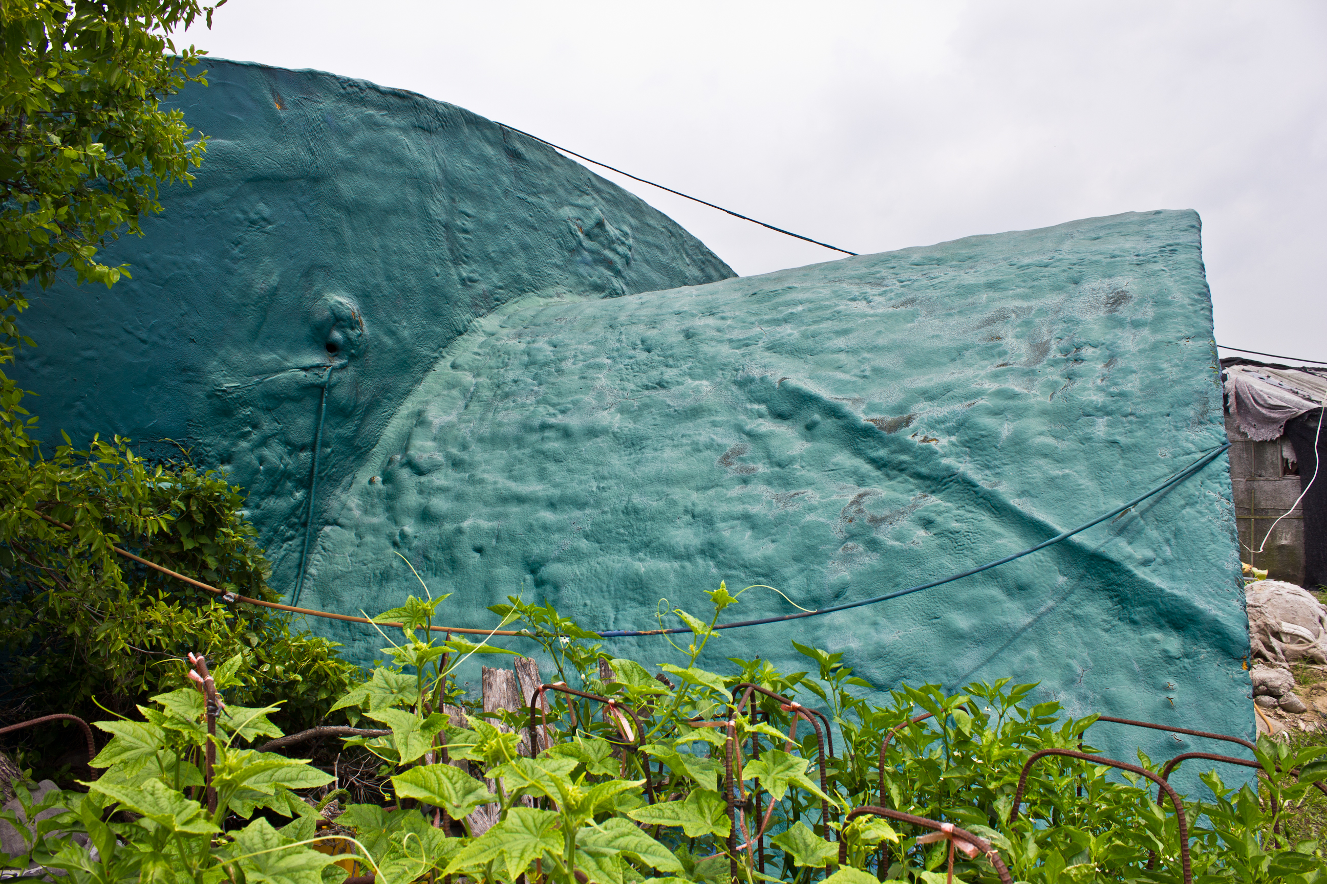 Many of the twenty Japanese bunkers in Daejeo were destroyed when the area was taken by Gimhae Airport in 1961. However, there are at least three left in Sinpyeong village. These bunkers built in the 1940s as hangers for small aircraft and were scattered across the central part of the wetland around present day Gimhae Airport. The bunkers’ design features two semi-circular sections that are joined in the shape of a “T” to accommodate the shape of an airplane. To create a mold for the shape of each bunker, soil was brought from Gangdong-dong Deokdosan (Mt. Deokdo) by train. They even constructed a temporary railroad track to transport the dirt over Pyeonggang River, a small stream that runs along the west side of Gimhae Airport. Inmates from Busan Prison, a kind of criminal reform or rehabilitation center, were allowed out to work on the bunkers. Once a dirt mound was formed, bulrush mats made from the reeds of the Nakdong were laid over the soil. Eighty centimeter thick concrete (2.6 feet) was poured over the dirt mound before all the soil was dug out, leaving the rounded, cave-like bunkers we see today. The grass used in the construction of the bunkers left imprints that are still visible in the ceilings today.9