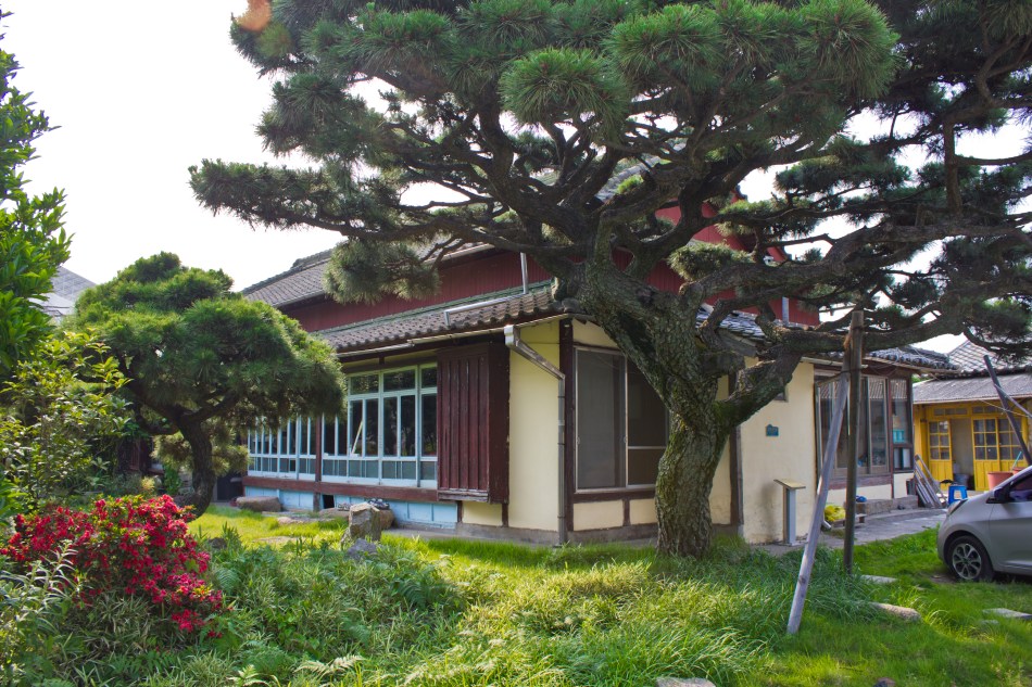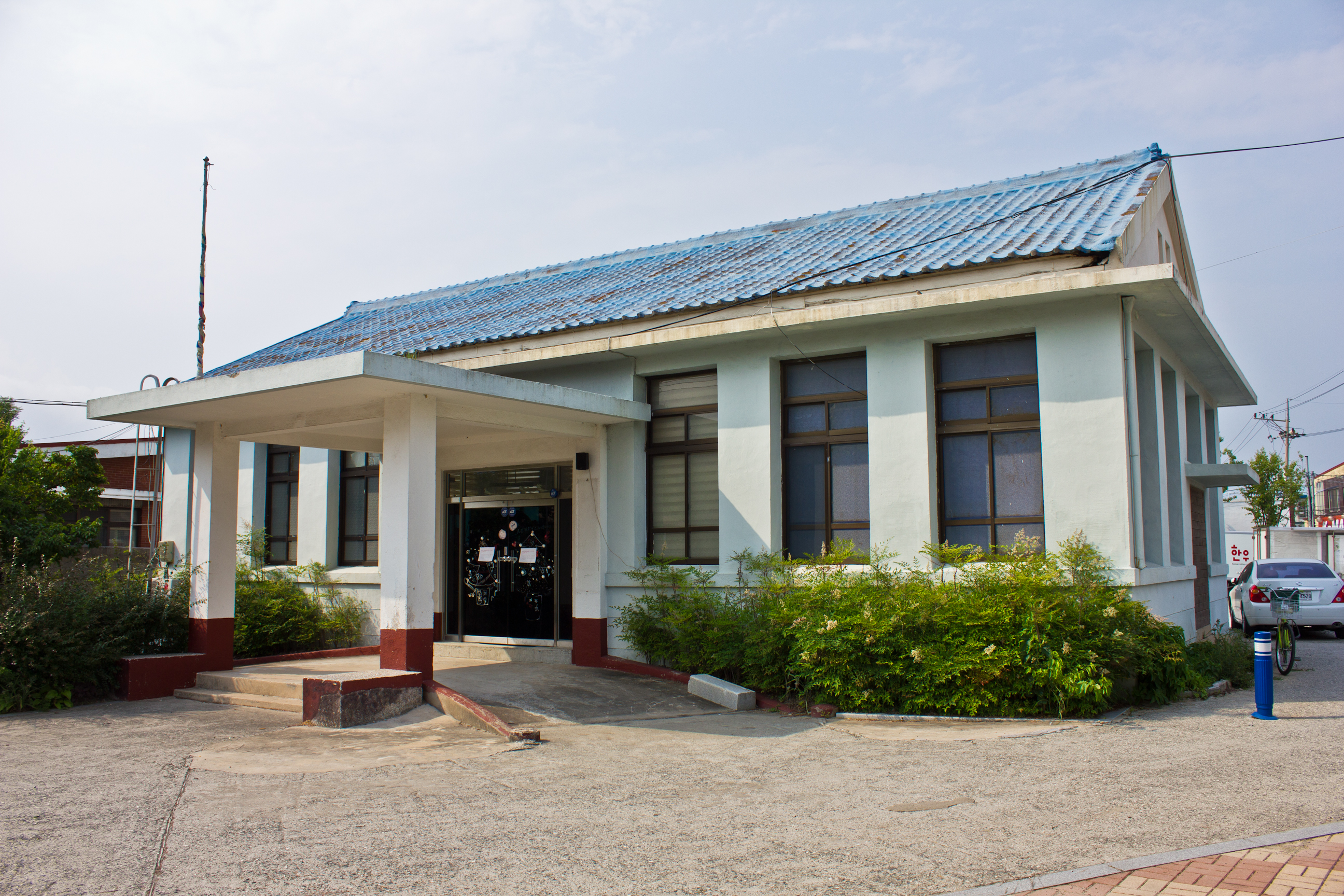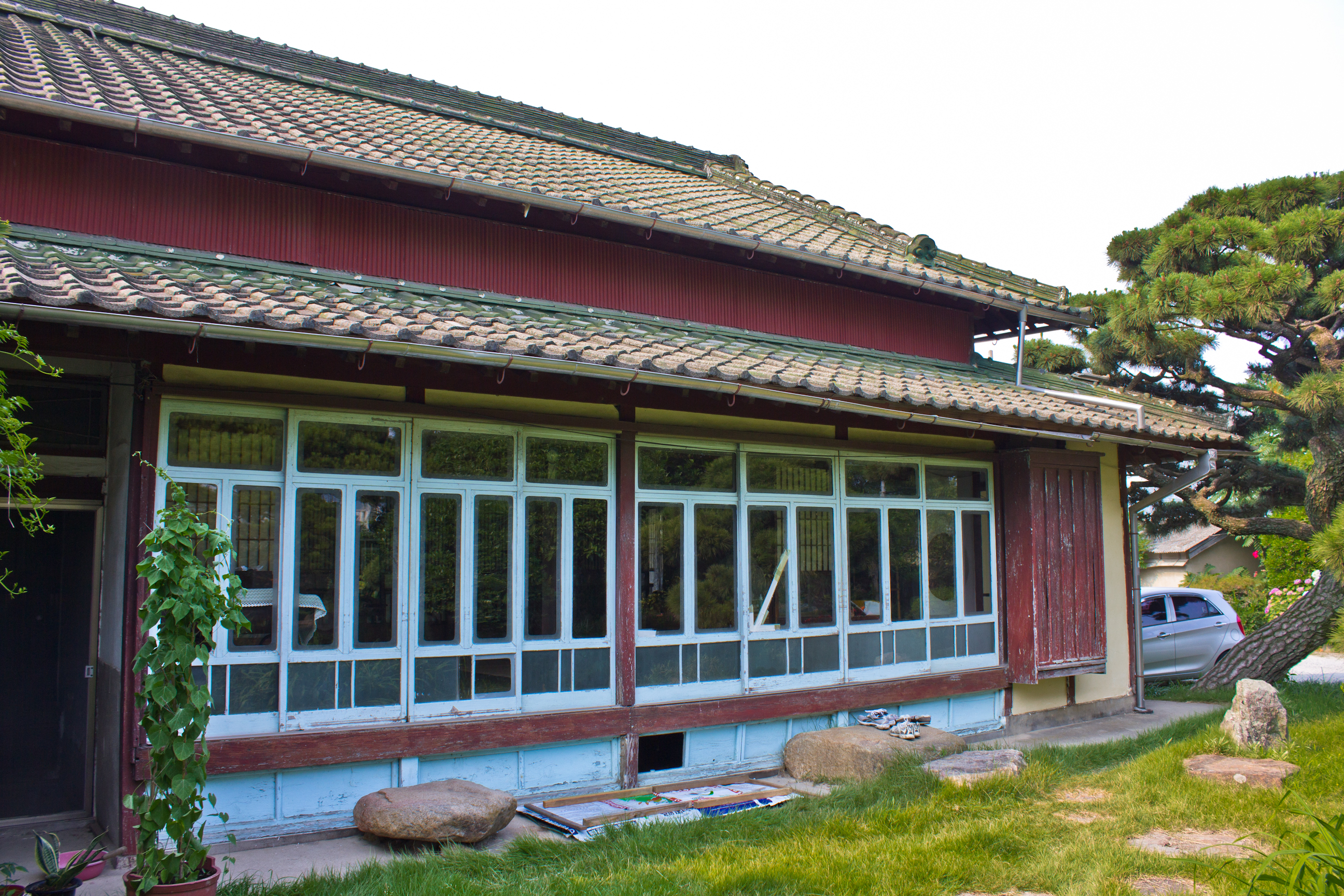 As you continue to walk north along Daejeo-ro 273beon-gil up to the old Gangseo-gu school, there are a few early or mid-century modern buildings whose exteriors have been altered. However, behind it, next to the new school, is one of the most beautiful Japanese houses in the Busan area. A small Edo or Meiji inspired garden conceals its facade from the street, but a walk up the driveway gives way to a nice view of the structure’s wooden exterior which has been painted over in red and blue. Built in the 1930s, this one story building seems to have a kind of “T” shape where a newer section for the kitchen juts out away from the original section facing the garden. A wooden storehouse sits behind it while another little building can be found on top of a small earthen retaining wall. Fortunately, it is a Registered Cultural Heritage of Busan.