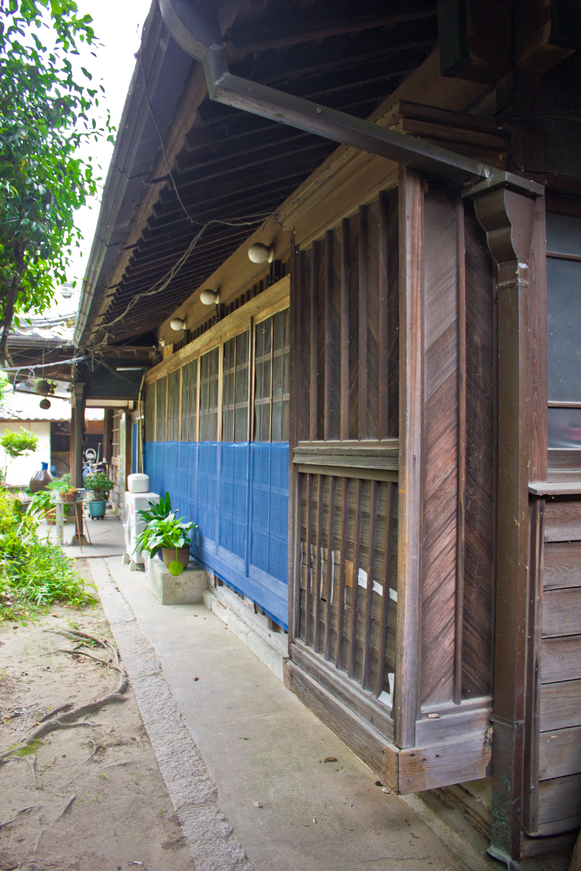 Another Japanese farm house sits behind a set of walls just a block over from the previously pictured home. Unfortunately, it has had its giwa roof painted over in blue, but it is still a good example of early modern architecture in the area.