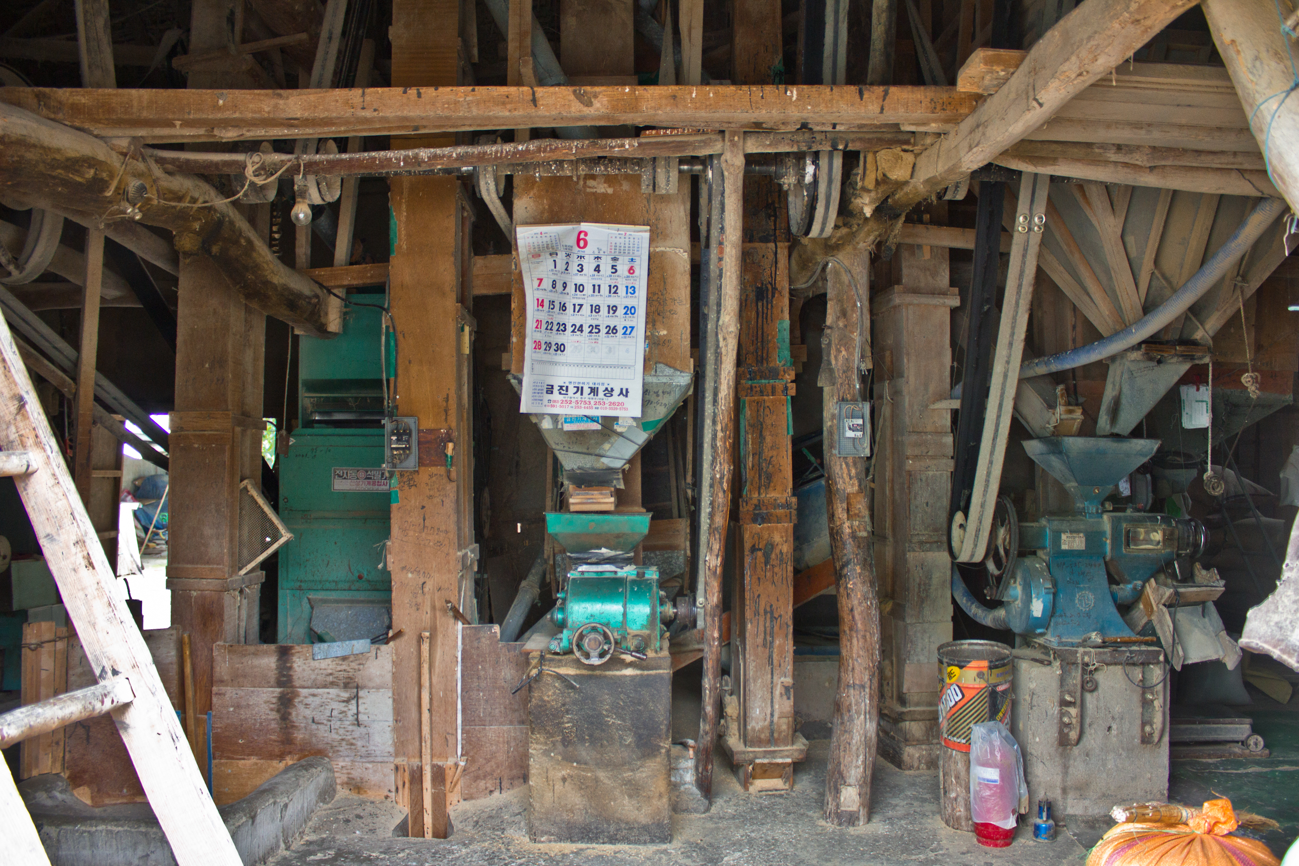 Dating to 1941, the structure has some information about it etched in Chinese in the center beam of the rafters. This means the mill has been in continuous operation for around seventy-five years. As you enter the structure from the street, you are greeted by three things: a giant calendar hanging on some really old mechanical machinery, piles of canvas rice bags, and lots of rice dust. On one wall hangs a rice sifter made of bulrush reeds that looks so old it should probably belong in a museum. Sparrows fly in and out of the roof’s center vent, making the whole thing pretty picturesque. The equipment itself appears to be quite old, and Mr. Ko was kind enough to explain the history of the place as well as how the sifters, winnowers, etc, worked. “You should’ve come yesterday when the machines were running,” he said in Korean. Taped to the front of one machine is an old document from the government, an income report of some kind, that shows the rice mill’s rates from 1987 to 1991. For example, in 1991, rice from this mill was being sold at 48,300 won per 40kg.