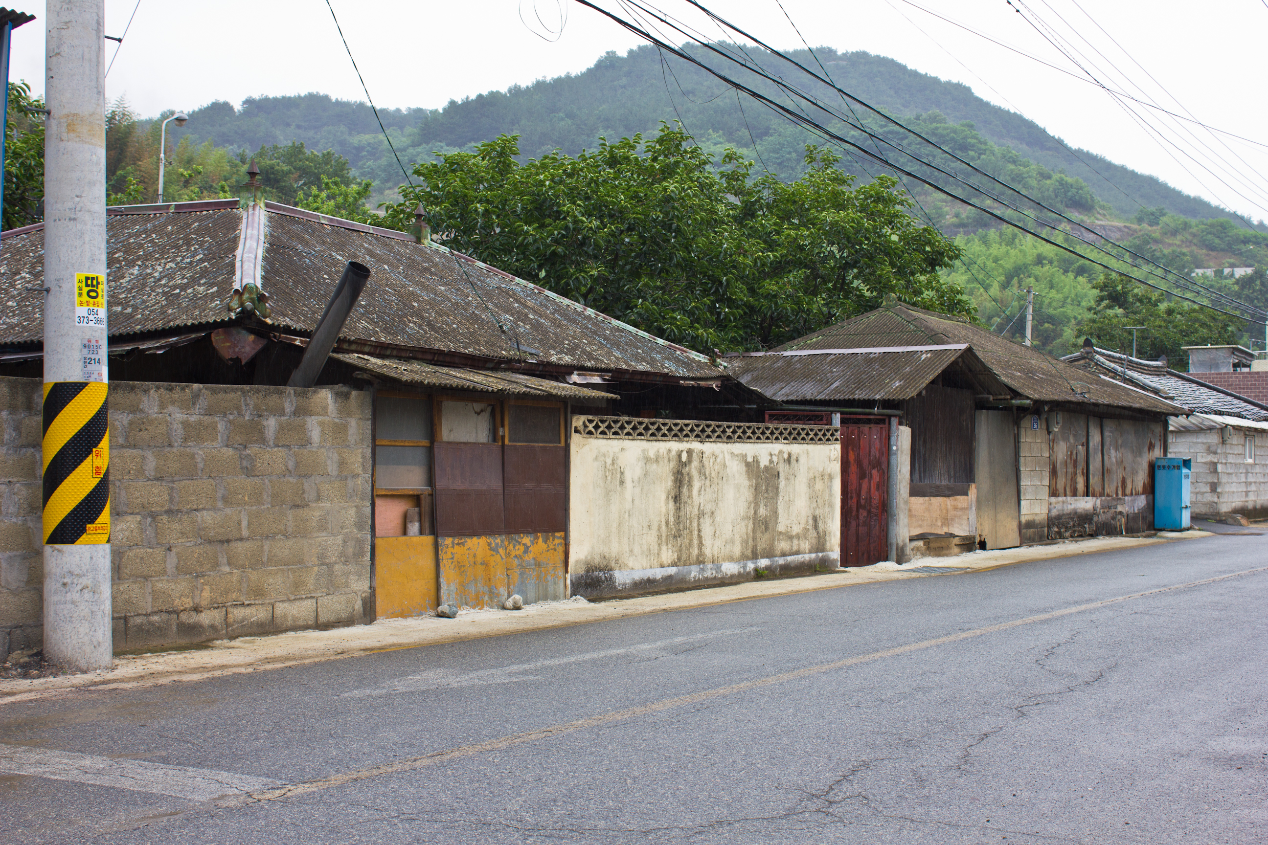 As seen in the previous photos of the movie theater, there is a one story colonial building between the rice mill and the theater, too. Across from the rice mill is the former house of Lee Ho Woo, a colonial period poet. He lived in this house with his sister after its construction in 1910.21 The hanok was off limits behind a wall, but a quick peek showed that it was similar to other hanoks in the town. Just past the rice mill, on the same side of the street, are a couple of warehouse looking buildings, with the bigger ones still being used (pictured below). A couple of patched up, one story hanoks with newer metal roofs and cinder block walls sit across the street.