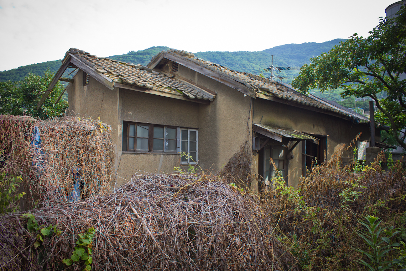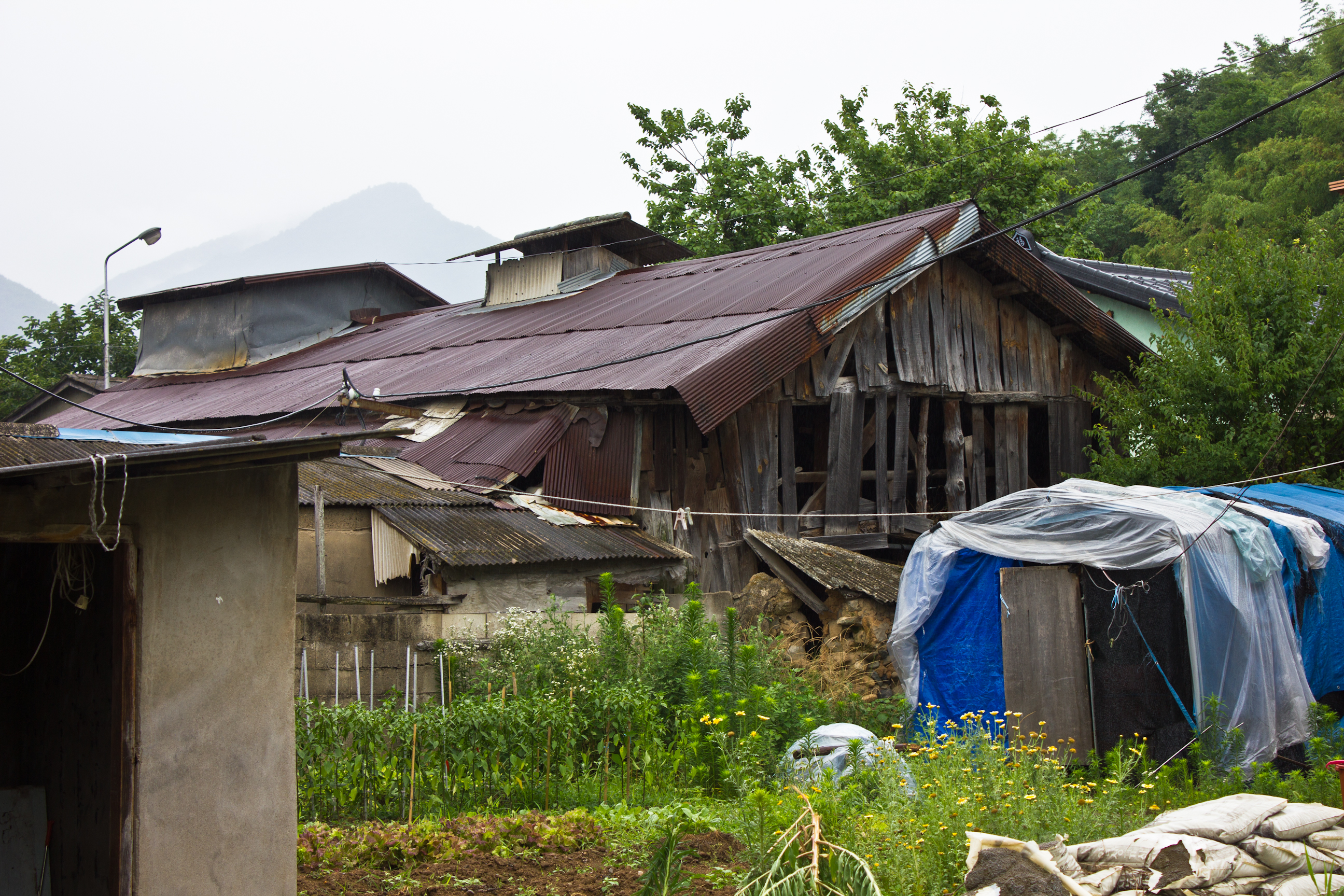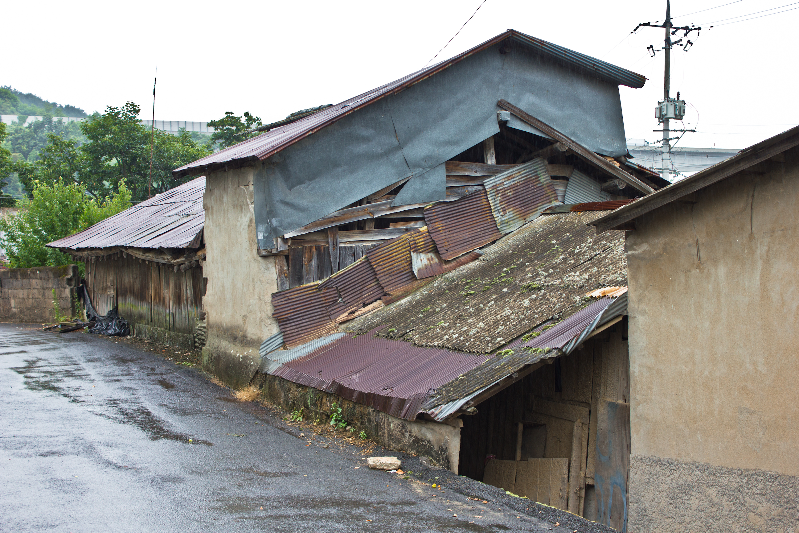 Another wood structure built in the same style as Yeongsin Rice Mill sits on one of the hill side roads in the the same section of town. Given its design, it would have also been a mill, factory, or warehouse of some kind. We can see how the vertically-laid plank walls are bursting at their seams, perhaps under the weight of the roof’s sagging frame, which was covered in metal sheeting at some point.