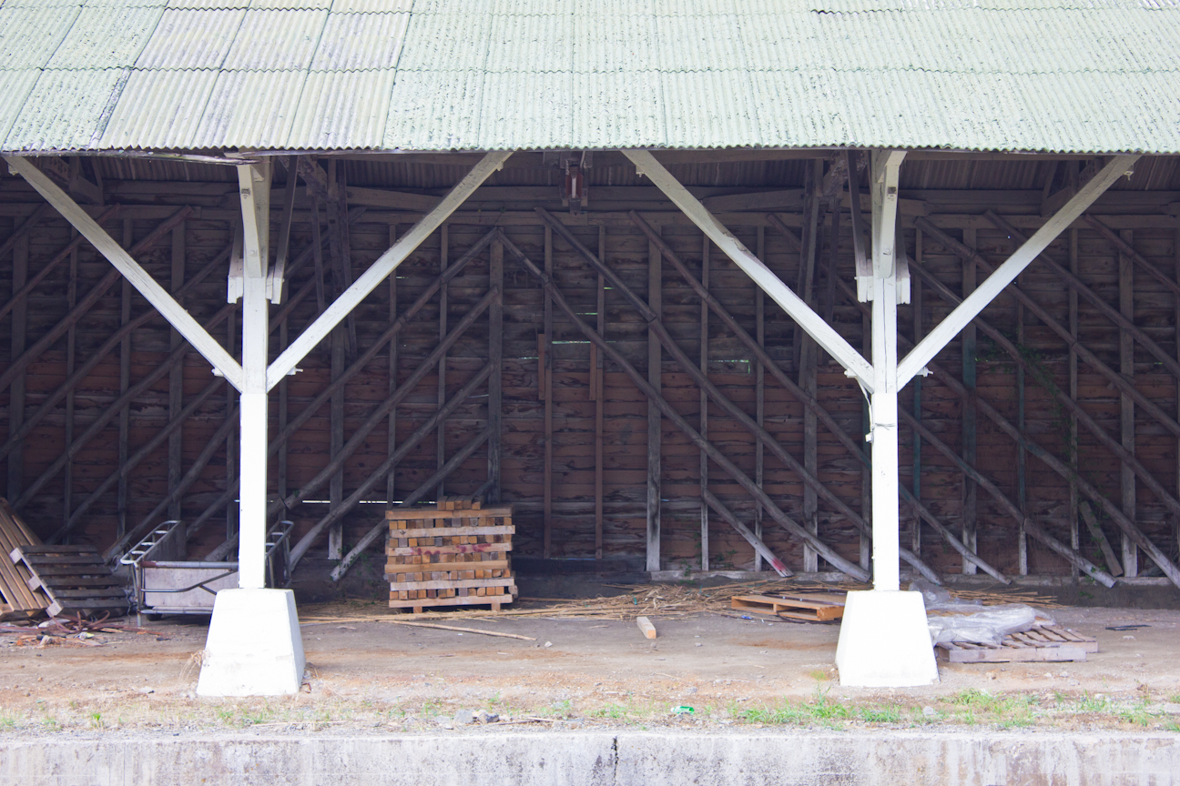 If you get to Cheongdo by train, the first early modern building you will see is a long, wooden structure with one open wall facing the tracks. An overexposed photo below shows that the frame uses cross beams from seemingly uncut logs to support its walls. It is not of any particular historic value other than being one of the two last colonial rail way structures at the station. The next building is an old water tower on the other side of the tracks. It appears to be built entirely of concrete and neither of these structures appear to be under any kind of local or national government protection.