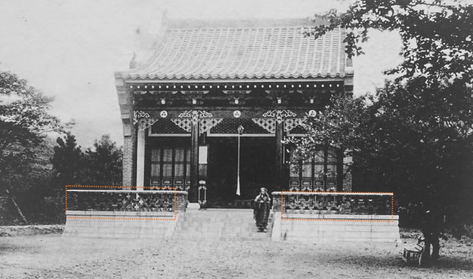 In a few seemingly rarer cases, it was institutionally adopted by non-Westerners. The stone fencing surrounding Wongaksa Pagoda in Seoul’s first modern public park, Tapgol Park, had the Qing cruciform pattern added to it in the early to mid 1910s.** In Pyeongyang, the gisaeng school clearly made use of Chinese style brickwork in its walls. Chinese architecture seems to have been mixed with Japanese temple design in the building of Deokhwangwaneumsa (덕환관음사), a Japanese Buddhist temple in the planned city of Jinhae. Japanese wood joints were used for the roof framing, but the ornamentation is rather Chinese. The temple not only made use of the perforated Qing cross in its brickwork, but the same cruciform pattern is copied in the structure’s decorative woodwork (pictured below; a more recent photo can be seen on a blog by clicking here. The temple was demolished around 2012).