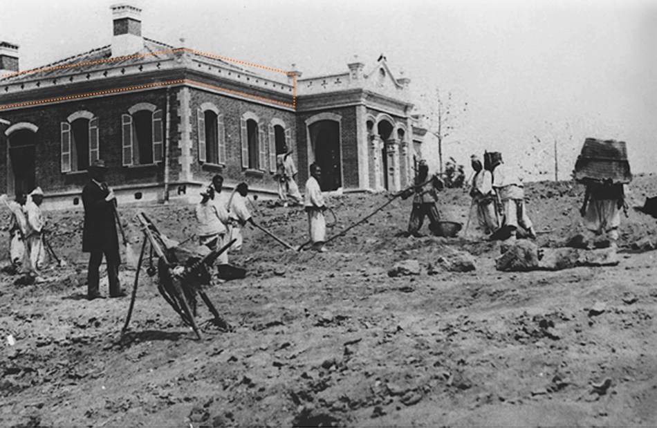 The earliest known example of this cross design appears to have been used above the top string course in one of the Paichai Academy buildings (1887-1932, pictured below). Christian missionaries relied heavily on Chinese labor in the construction of their homes, churches, and medical facilities, favoring them as workers over other people groups due to their perceived strong work ethic.13 This means that the Qing cross was commonly featured in Christian operated schools, like a building on the campus of Ewha, photographed around 1938 (pictured below).