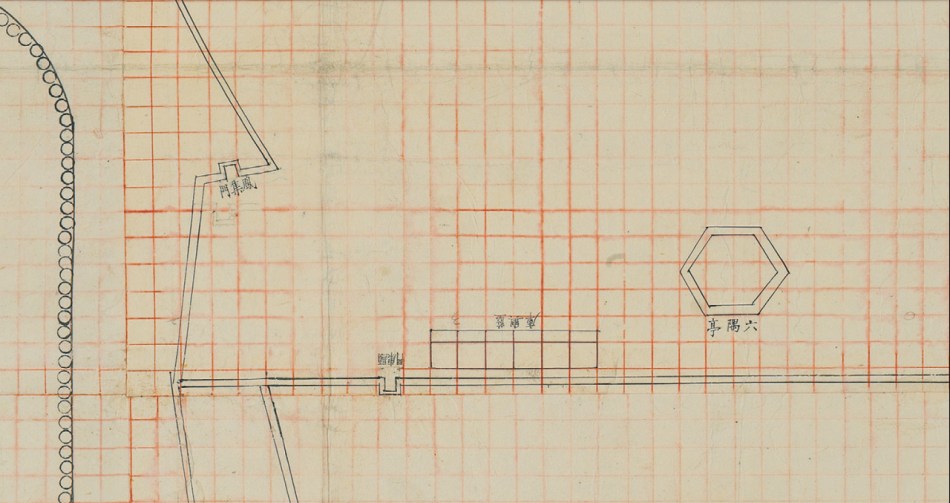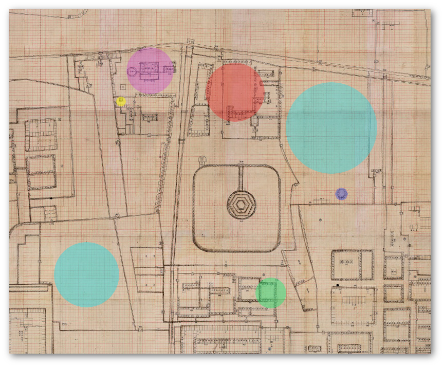 Figure 8. A section of a map of Gyeongbokgung, Bukgwoldohyeong, showing points of architectural interest. The yellow area indicates where the clock tower stood. The purple area, Jipokjae. The red area, where Gwanmungak stood. The green area, where the Edison power plant was built. The purple area, a small Korean pavilion (pictured below). The light blue areas, vacant sections of Gyeongbokgung where Salabelle’s palace could have been located. The NRICH presumes this map to have been made in 1907, of which there were several versions, but it may have been earlier. Source: Bukgwoldohyeong Architecture, National Research Institute of Cultural Heritage, 2006.