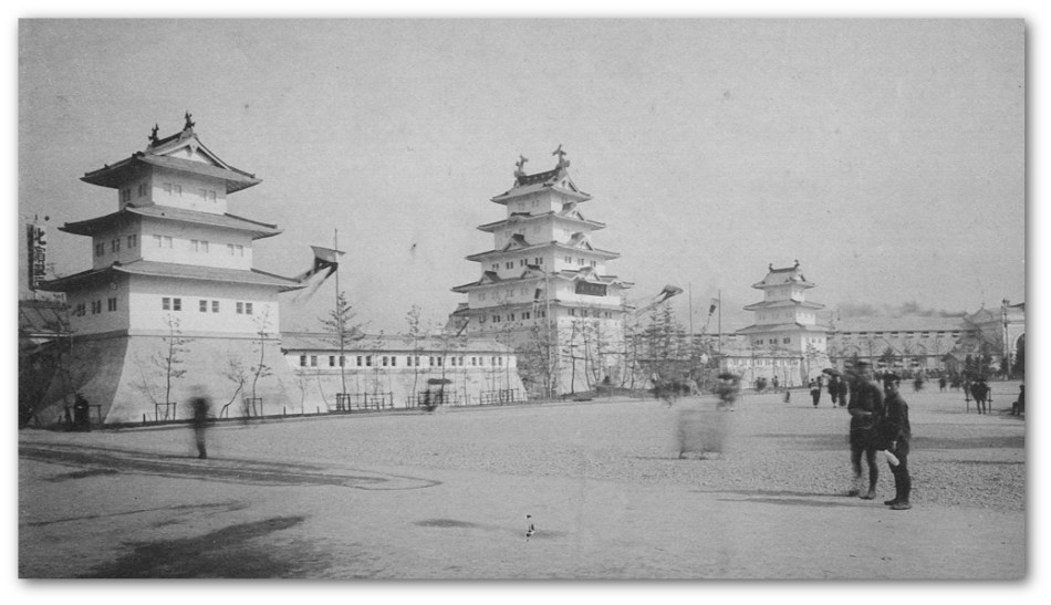 Figure 12. A photograph depicting the Aichi/Nagoya section of the Fifth National Industrial Exhibition of Japan at Osaka in 1903. The castle structures shown here were copied from Nagoya Castle. Source: National Diet Library [Japan].