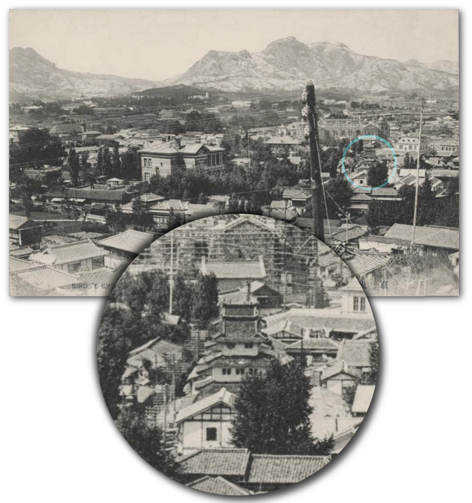 Figure 13. A postcard from the late 1900s showing a section of the Japanese settlement at Namsan, Seoul. The magnified section of the image shows two buildings that match the description and appearance of the Nagoya Castle miniatures reportedly brought to Seoul. Source: International Research Center for Japanese Studies.