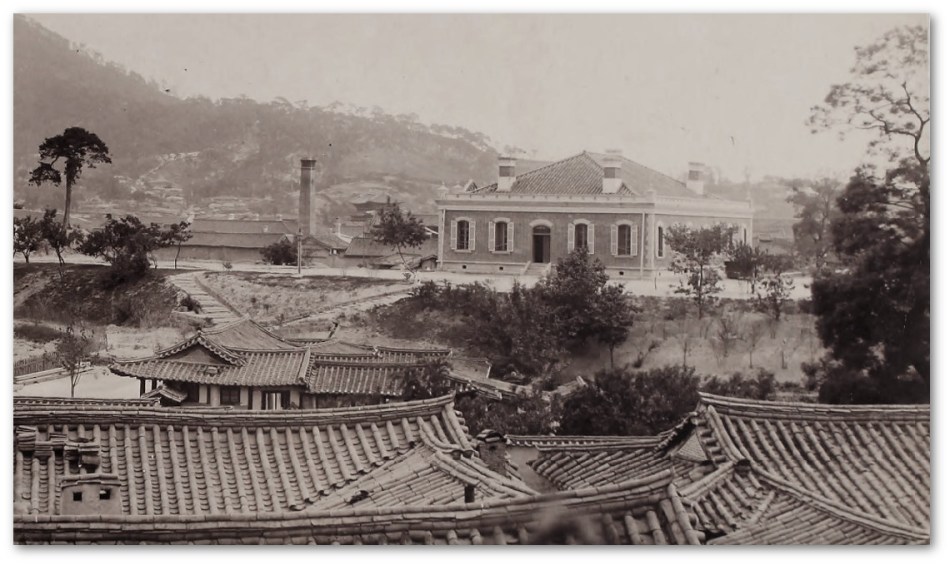 Figure 10. A rear-side view of the original Pai Chai Academy (Baejae Hakdang) building in Jeong-dong, designed by Yoshizawa. Undated, circa 1890s-1900s. Source: Moffett Korea Collection, Princeton Theological Seminary Library.