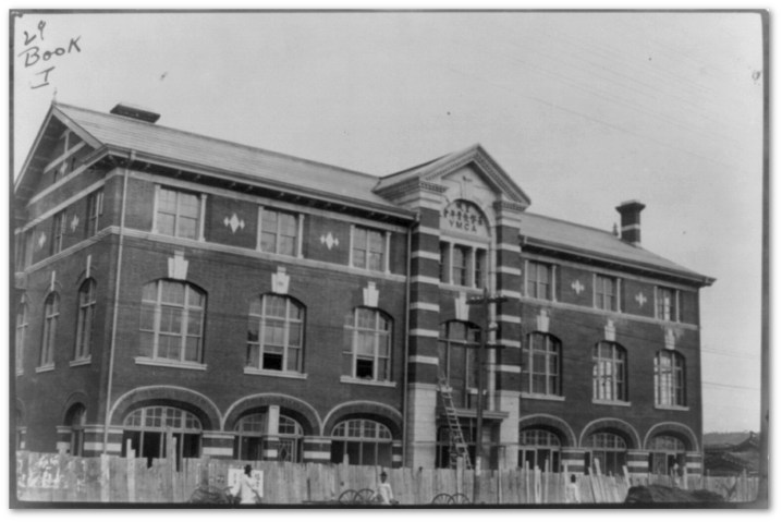 With the industrial department building behind the main building, there was then a third building erected along the thoroughfare next to the main building. This was probably the “boy’s building” designed by Hussey, which seems to have included the gymnasium. Brockman’s report from October 1914 indicated that Gregg was, at the time, busy overseeing the construction of the third building, clearly referencing working on a “boys’ department and gymnasium.” It took up a significant amount of real estate, spanning much of the remaining street-front space between the original YMCA building and the former offices of Collbran & Bostwick. Its form and facade were very similar to the original building, though the windows on the upper floors were different and the roof contained mono-pitched dormers. The building was completed sometime between 1914-1919, however probably finished by 1916.33