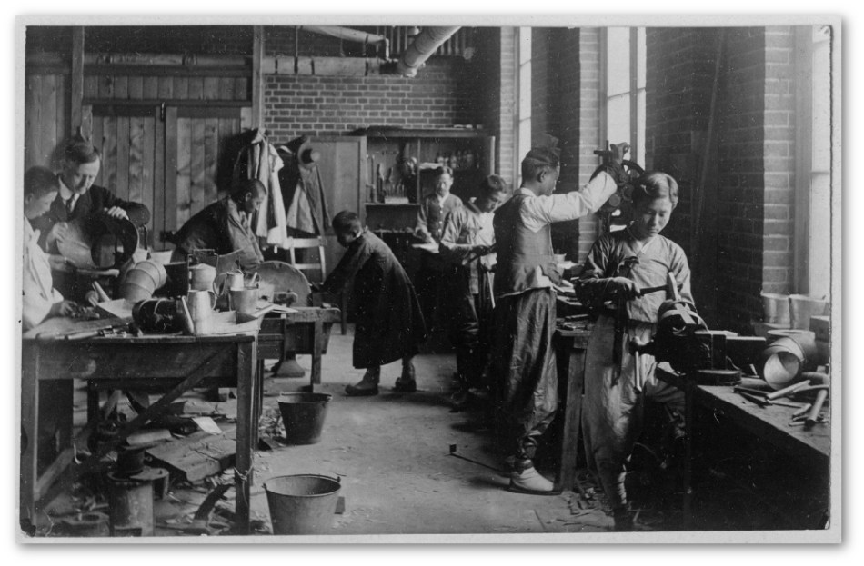A report written by YMCA secretary Frank M. Brockman indicates that the industrial department building was actually built, placing its construction sometime after Hussey’s visit in 1911 but before Brockman’s report was published in October 1914.30 The industrial department was erected in conjunction with two new utility structures during this time: an electric plant and a steam dry kiln (for drying timber) — the kiln being a significant brick structure that was claimed to have been “the first building of its kind to be erected in this land.” All three buildings were constructed next to each other on the YMCA grounds, with the utility buildings necessary for the operation of the woodworking, metalworking, leatherworking, and commercial photography shops found within the new industrial building. Construction of the industrial building was reportedly entrusted to an unnamed Chinese builder who had studied technical architectural drawing with the YMCA itself, formerly having served as a head teacher there. The finished building was ultimately about 800 square feet smaller than originally planned by Hussey, reportedly built at 43 x 56 instead of 40 x 80.31 Why this change was made is unclear, however one wonders whether or not it was a result of the Chinese builder’s involvement since Hussey’s designs in China were often altered by local builders as well.32