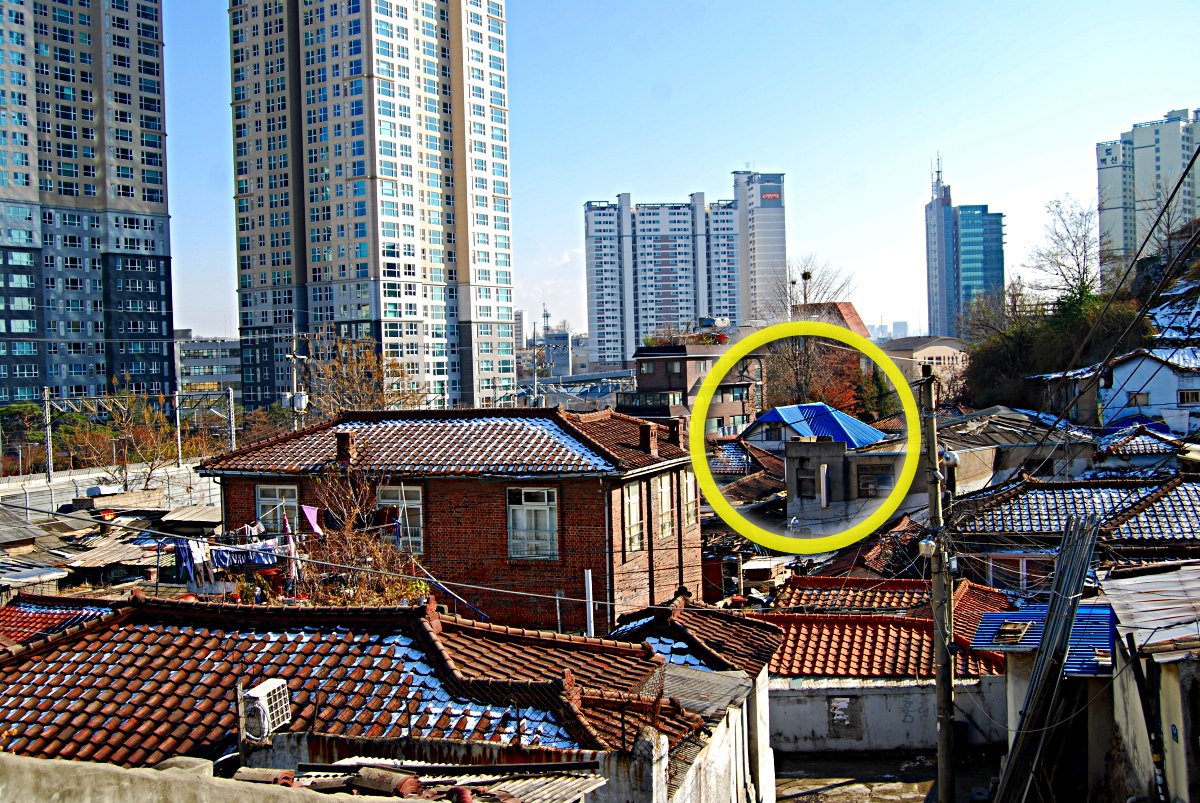 Figure 34. A wide view of the Singye-dong neighborhood in Seoul, which housed many Japanese residents during the colonial period and had a number of modern housing types. The house circled in yellow appears to have been a remaining culture house design. This neighborhood was demolished around 2007-2008 to make way for new apartment blocks. Source: Courtesy of Robert Koehler, 2007.