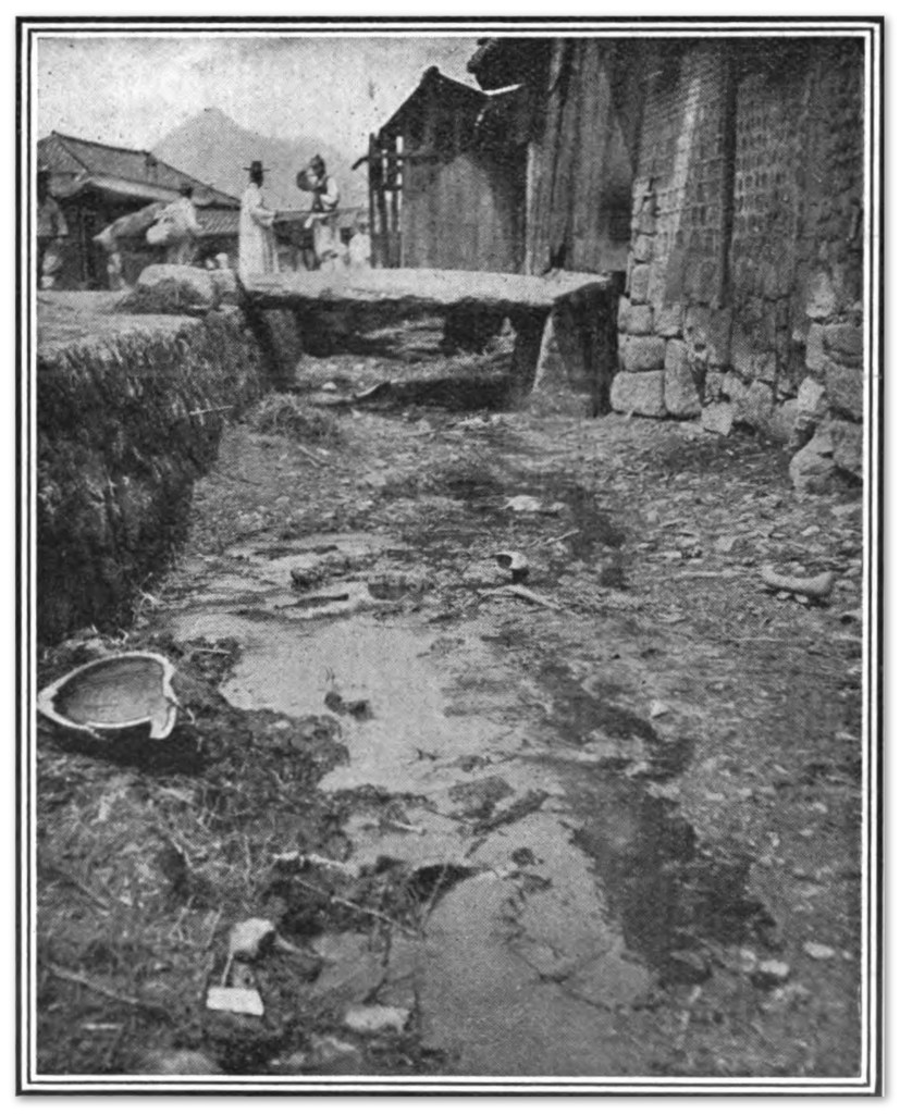 Figure 22. An image showing waste in an open sewer in Seoul. Note the building in the background that appears to extend over the sewer. Source: The Assembly Herald 10, no. 11 (1904), University of Wisconsin, HathiTrust Digital Library.