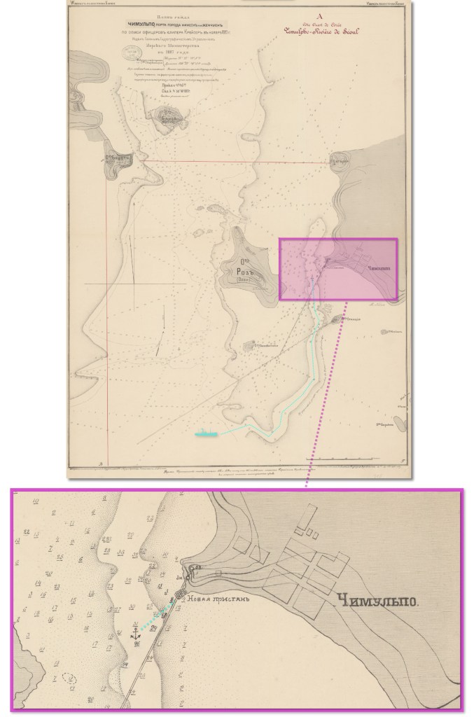 Figure 10. A Russian-made maritime map from 1887 appears to depict the few town blocks that had been built up in Chemulpo in just four years. The blue ship icon and path have been added to the map to illustrate how vessels could successfully navigate their way to the port town without bottoming out on the mudflats. The anchor icon depicts where visitors would drop anchor before continuing on to the jetty in a sampan. Source: BnF Gallica.