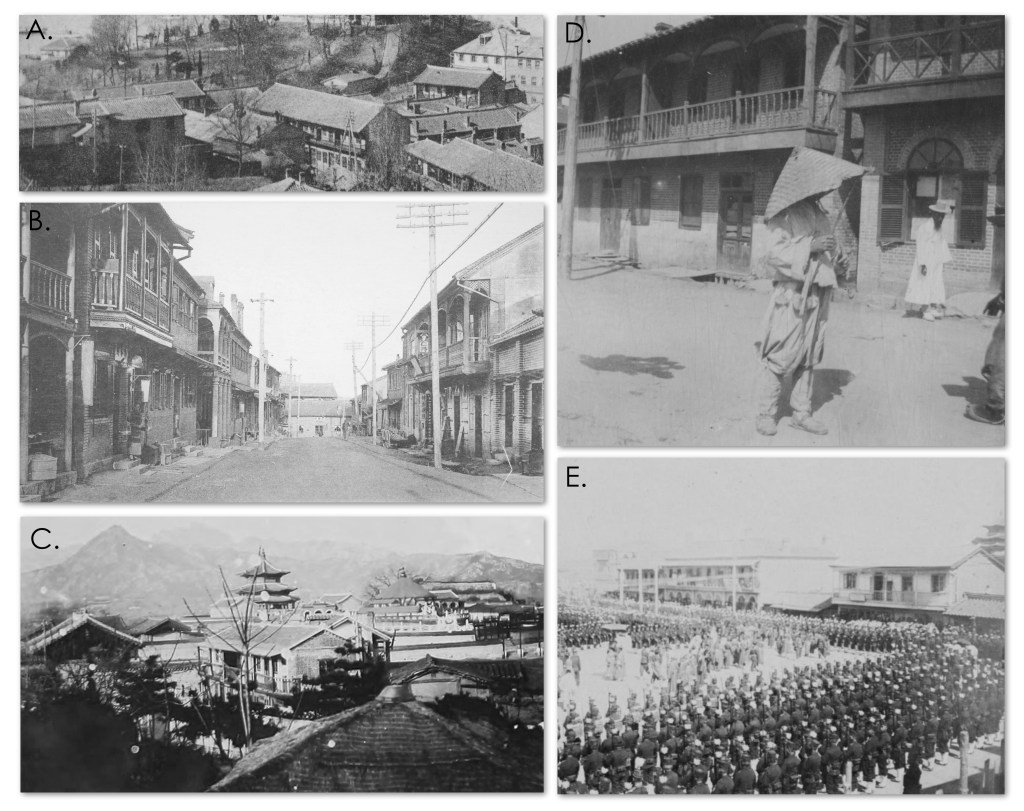 Sources: (A) Undated postcard from the late 1900s to early 1910s, Nate Kornegay collection, (B) Undated postcard from the 1910s-1920s, Nate Kornegay collection, (C) Photograph of Wongudan area, Esther Shields album, Princeton Theological Seminary Library, (D) Willard Dickerson Straight Collection, Cornell University Library, (E) Corée Séoul Sortie du Palais de l’empereur Yi-hyeng, le cortège. Ministère de l’Europe et des Affaires étrangères.