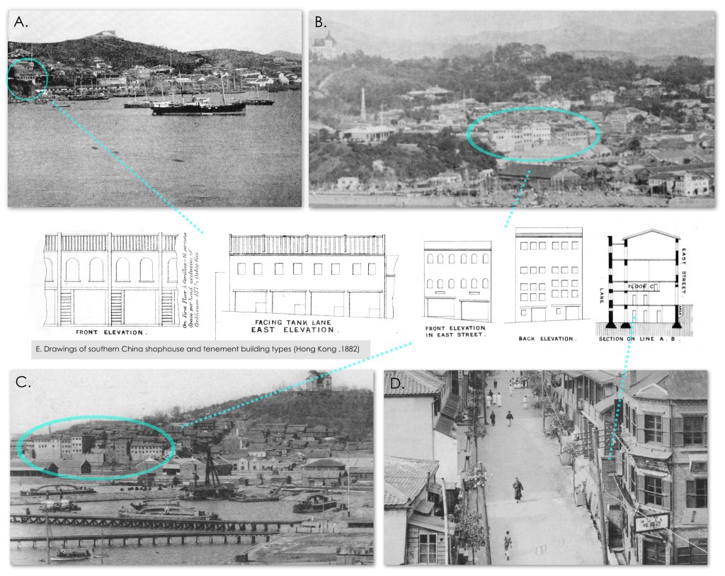 Figure 3. Images of Chinese-type “tong lau” buildings in Chemulpo compared to drawings of shophouses and tenement buildings in 1882 Hong Kong. (A) A published photograph of Chemulpo in the 1890s, (B) a postcard showing Chemulpo in the 1910s-1930s, (C) a postcard showing Chemulpo in the 1920s-1930s, (D) a postcard depicting the way in which some Chinese buildings at Chemulpo were built below street level like some buildings at Hong Kong, (E) drawings made by engineer Osbert Chadwick (1844-1913) during his survey of sanitary conditions of Hong Kong.