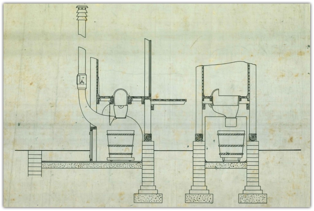 Figure 31. Plans of toilets at the 1908 government hospital in Seoul [Daehan uiwon/Taikan iin] show a bucket for collecting and disposing of feces. A trapdoor on a chain attached to the “throne” prevented odors, bacteria, etc, from rising into the room. A vent meant to evacuate odors and gas appears to have a candle in the middle of the flue, perhaps used to create a draw. Source: National Archives of Korea.