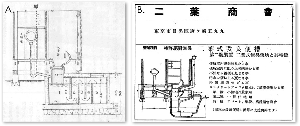 Figure 33. (A) The Hygiene Bureau’s improved latrine/tank from 1928, (B) the Futaba-type improved toilet tank from 1940. Sources: (A) Chōsen to kenchiku (June 1928), (B) Kenchiku nenkan (1940), National Library of Korea.