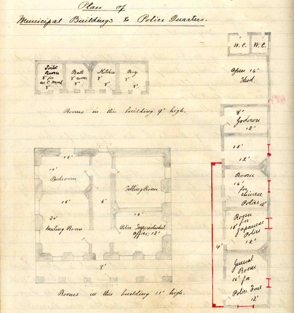 In contrast, a proposed plan of the Municipal Council Buildings and Police Quarters at Chemulpo indicate three different dedicated W.C. rooms, of which at least two were likely outhouse privies. The arrangement of the buildings in the plan seems to imply that the two outhouses would serve the police, while the other W.C. — which was doubly labled as a “Toilet Room” indicative of a washstand, commode, etc. — would serve the Municipal Council members and visitors. All the council’s W.C.s were detached from the main office and living rooms.