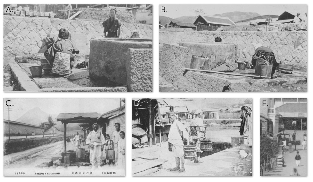 Figure 34. (A) Japanese settlers appear to be both washing next to and drawing water from a well or cistern at Fusan in 1904, (B) the same Japanese settlers can be seen with a pair of kerosene cans used for carrying water, (C) a Korean man with a pair of kerosene cans at a water well in the Seoul area, probably 1900s-1910s, (D) Korean men with water buckets at a well or cistern in Seoul, (E) the water well in front of the Daibutsu Hotel at Chemulpo in the early 1890s.
