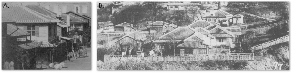 Figure 4. Images depicting detached, hip roof vernacular Japanese buildings. (A) Two detached Japanese buildings near the Daibutsu Hotel, (B) Japanese government officials’ homes at Namsan, Seoul. Sources: (A) Princeton Theological Seminary Library, (B) From a photo album [27 phot. du Japon en 1878 (dont une en couleurs) et 54 cartes postales de Corée et du Japon (certaines en couleurs), vers 1903-1905, provenant de Collin de Plancy. Don 1928], BnF Gallica.
