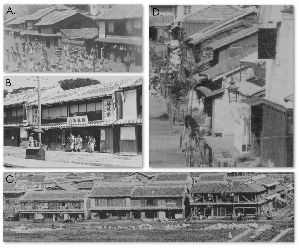 Figure 5. Images depicting vernacular Japanese shophouses / townhouses. (A) Several two-story and one-and-a-half-story Japanese houses in the Japanese settlement at Namsan, Seoul circa 1900, (B) A textile/fabric business in a Japanese shophouse at Fusan, circa 1904, (C) Blocks of Japanese shophouses under construction at Masan, (D) A row of one-and-a-half-story Japanese shophouses in Chemulpo, 1890s.