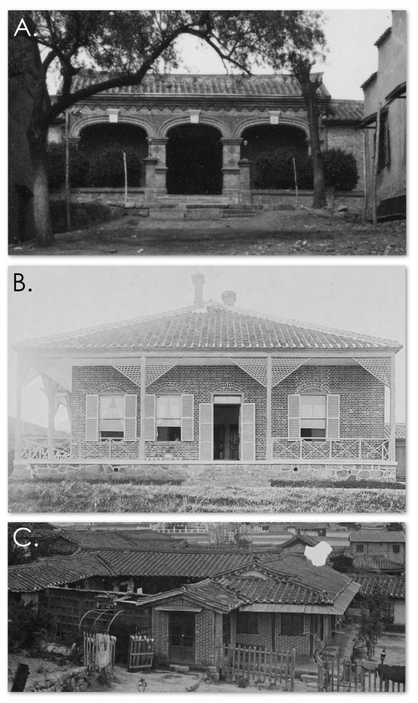 Figure 7. (A) An undated photograph depicting the Chinese consulate at Chemulpo, (B) the Presbyterian mission house outside Fusan, probably photographed before 1900, (C) an unidentified modified-Joseon house photographed c1904 near Wongudan, Seoul. Sources: (A) National Museum of Korea via eMuseum, (B) Princeton Theological Seminary Library, (C) Jack London Collection, Huntington Digital Library.