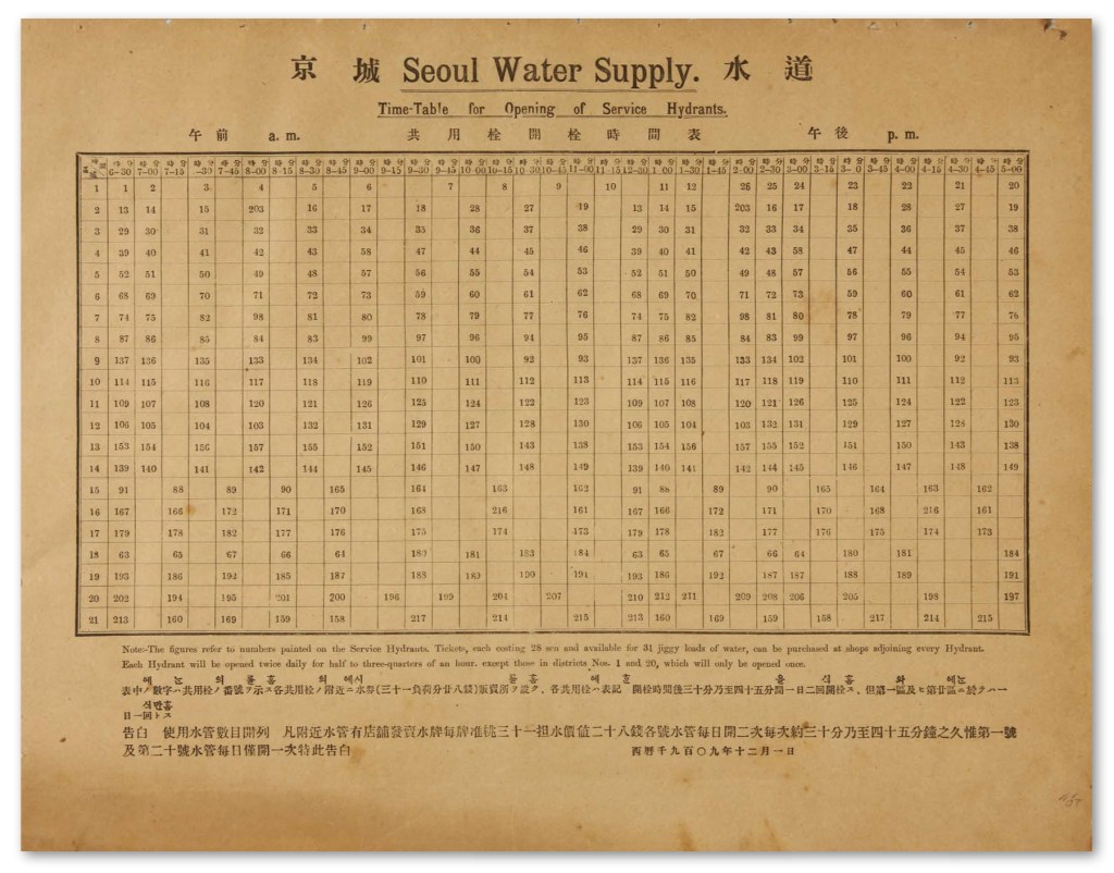 Collbran & Bostwick had proposed a system of hydrants positioned at specific points throughout the city from which residents could fill buckets to take home, with very few individual buildings and homes connected directly to the system.29 The hydrant system, though generally cleaner, was little different than pulling water from a well to carry home. A time-table published in the Korean Daily Report [Taikan mainichi shinpō] in December 1909 does much to show how this system worked, with hydrants in different districts open for use at certain times throughout the day. This was presumably to keep from demanding too much of the water supply system.
